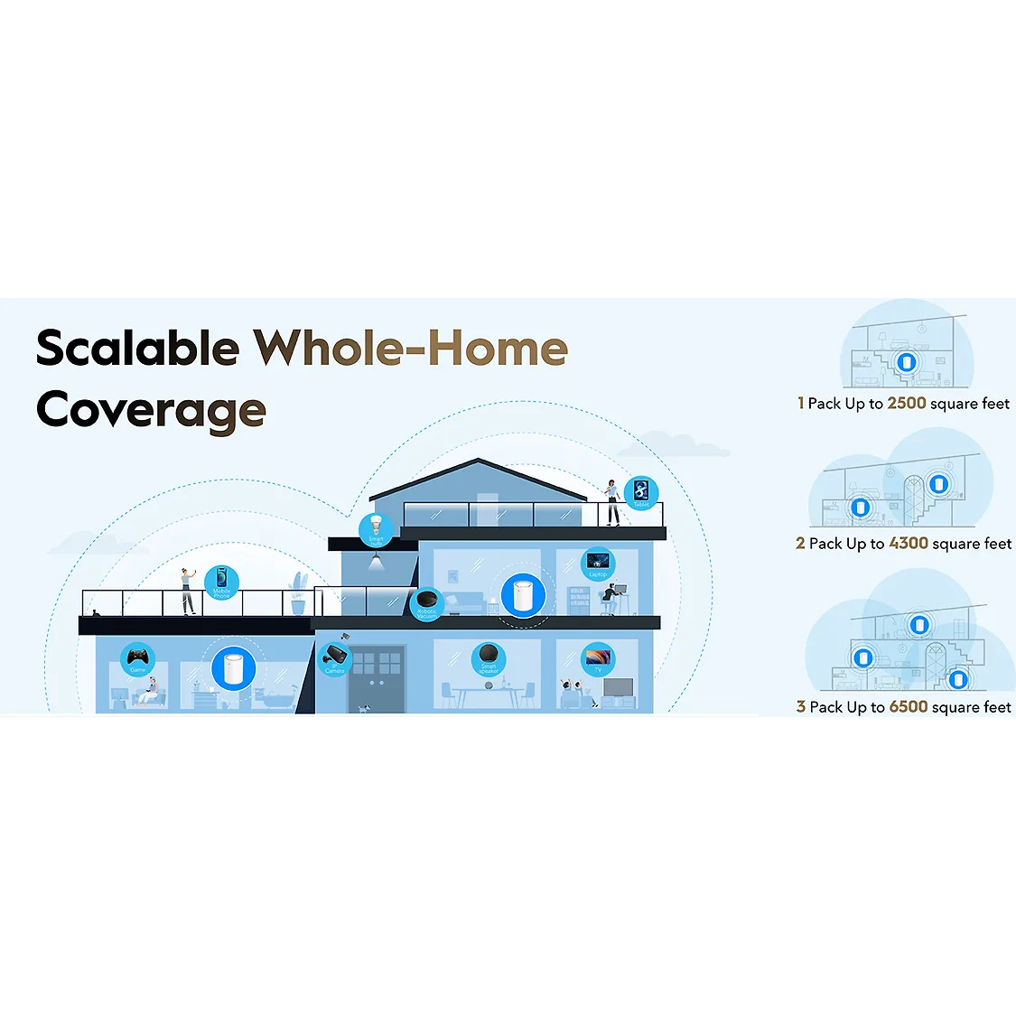 - Whole-Home Mesh Wi-Fi 6: Covers up to 7500 sq. ft (approx. 2500 sq. ft per node) with seamless roaming.