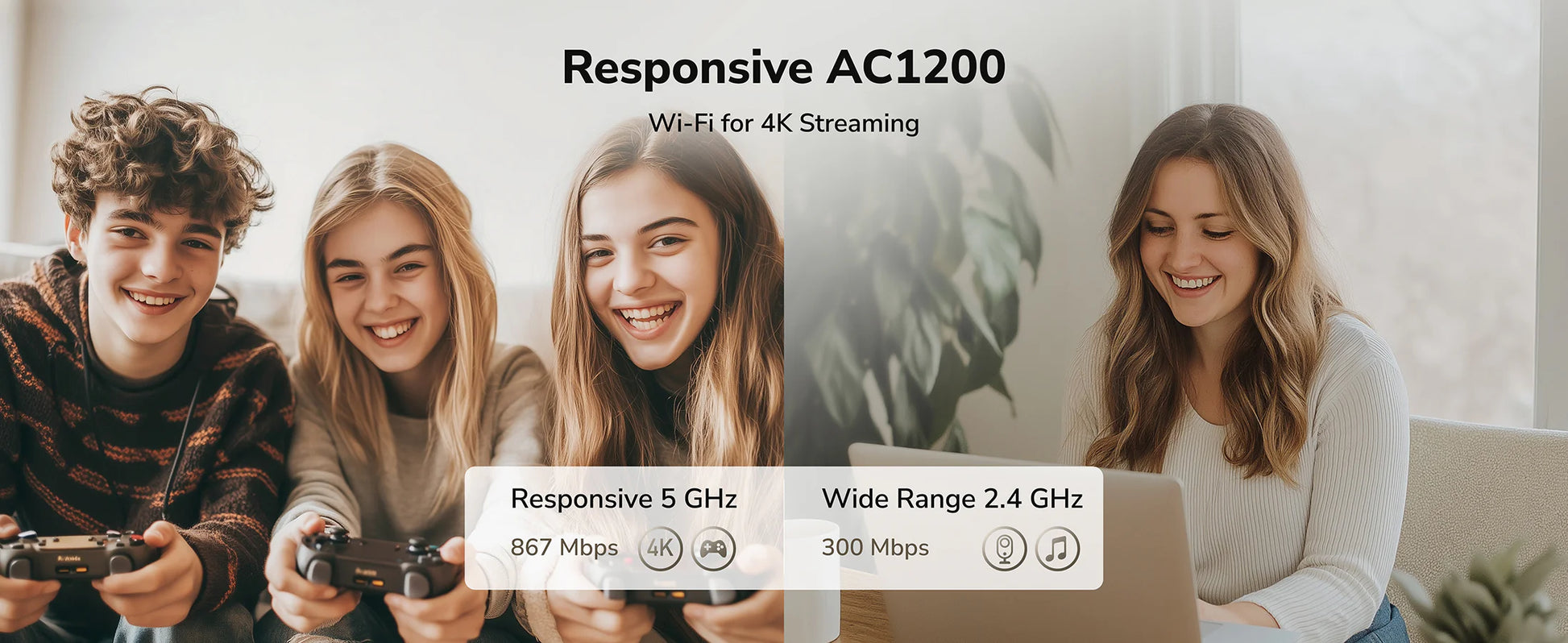 - Dual‑band AC1200 Wi‑Fi 5: 867 Mbps @5 GHz + 300 Mbps @2.4 GHz