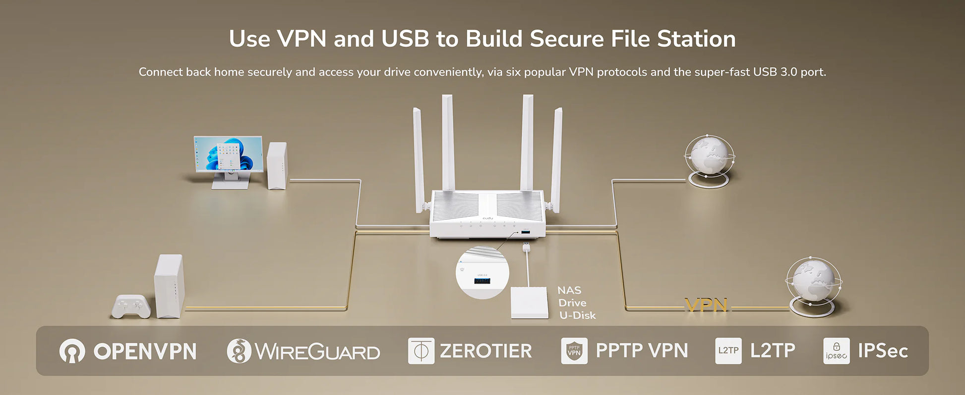 - Built‑in VPN server/client: WireGuard, OpenVPN, IPsec, PPTP, L2TP, Zerotier