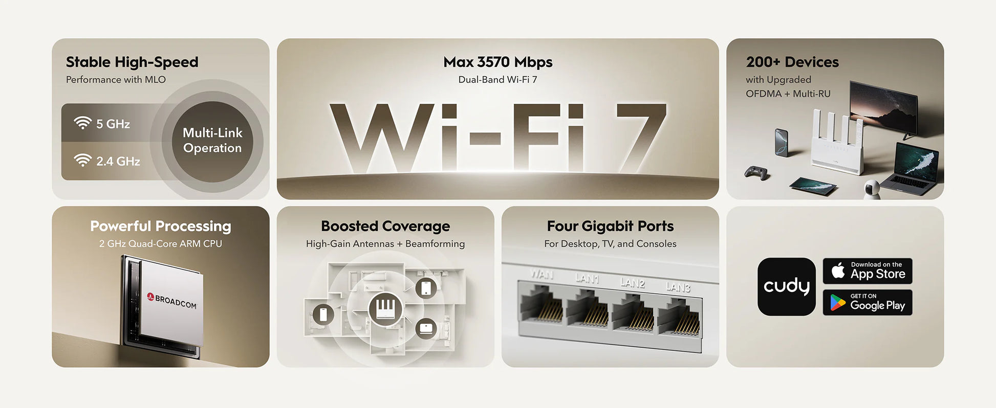 Cudy WR3600E-1.0 Dual-Band Wi-Fi 7 Router – 4× Gigabit LAN, 2 GHz Quad-Core, Up to 3.57 Gbps, WPA3 & Mesh Support