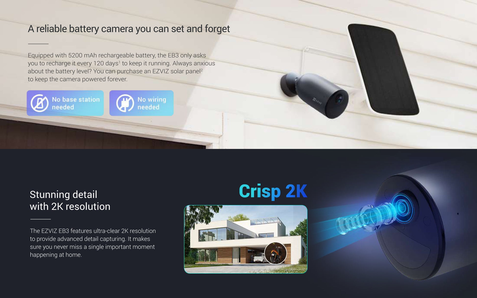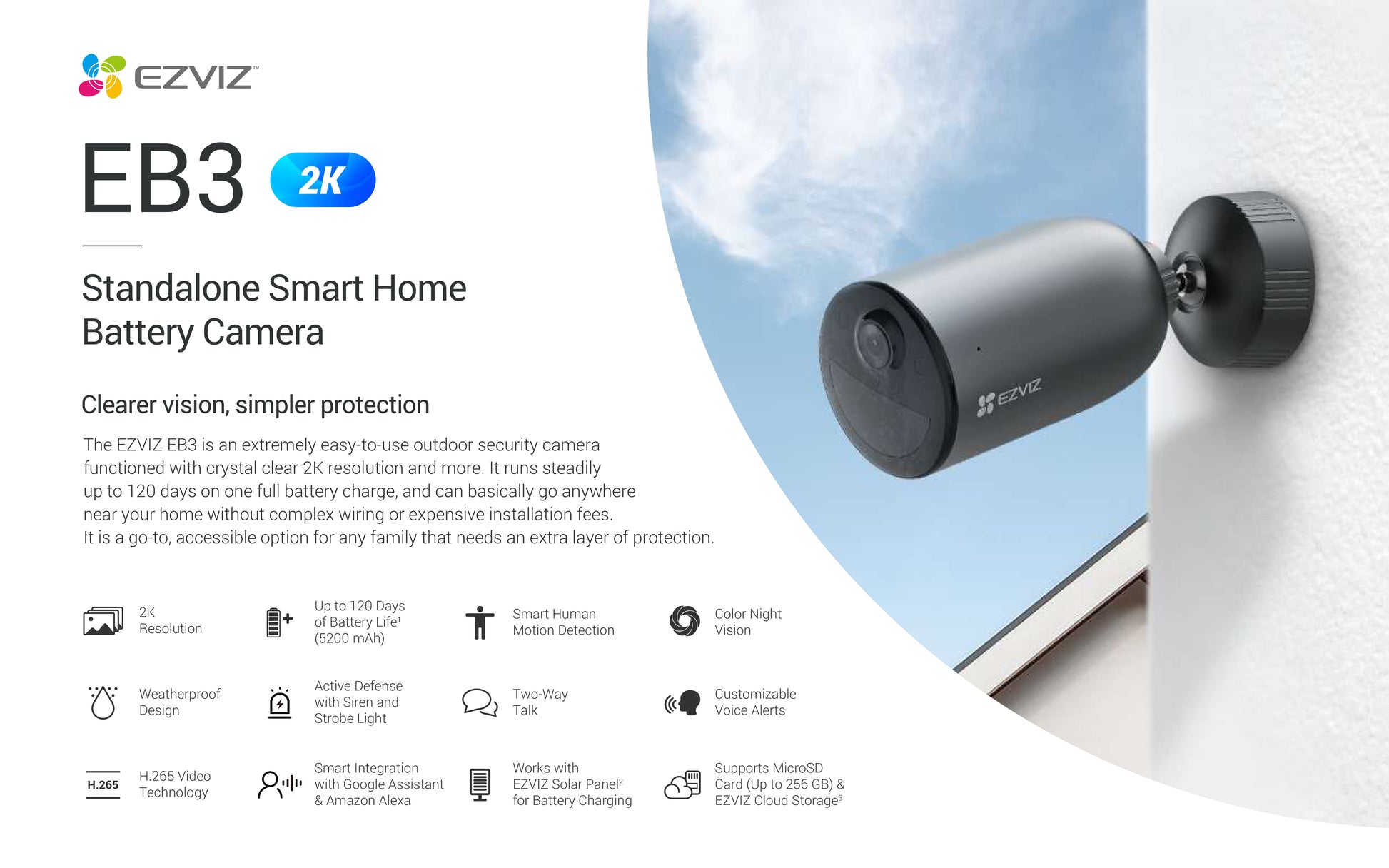 EZVIZ EB3 2K Battery-Powered Outdoor Security Camera, Color Night Vision, Smart Human Detection, 120-Day Battery, Alexa Compatible