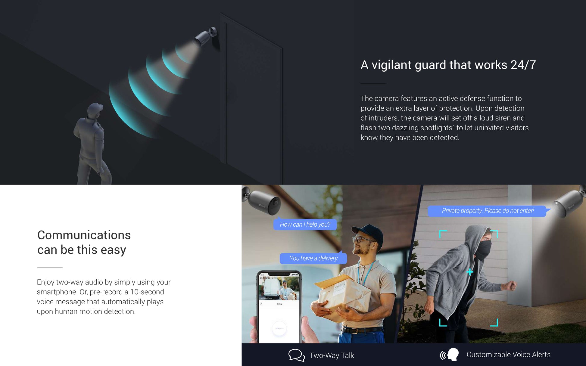 - Active Defense System: Built-in siren and flashing spotlights activate to deter intruders upon detection.