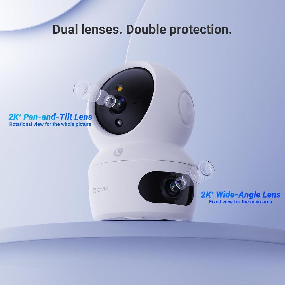 Protect your entire space with the EZVIZ H7c Dual, a smart indoor camera featuring dual 2K+ lenses for panoramic and fixed views. Designed to eliminate blind spots, it combines AI-powered detection, two-way audio, and vibrant color night vision for a comprehensive home security experience. With support for dual-band Wi-Fi 6, smart tracking, and voice assistant integration, the H7c Dual redefines convenience and security in one compact device.