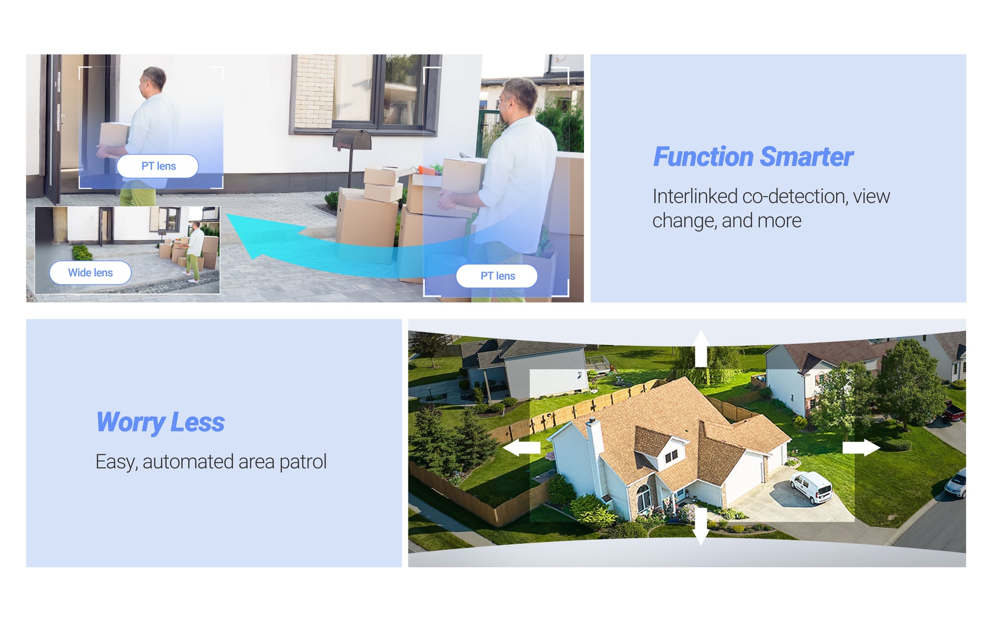 - 3K Dual-Lens Camera: One wide-angle lens and one telephoto pan & tilt lens for unmatched coverage and clarity.