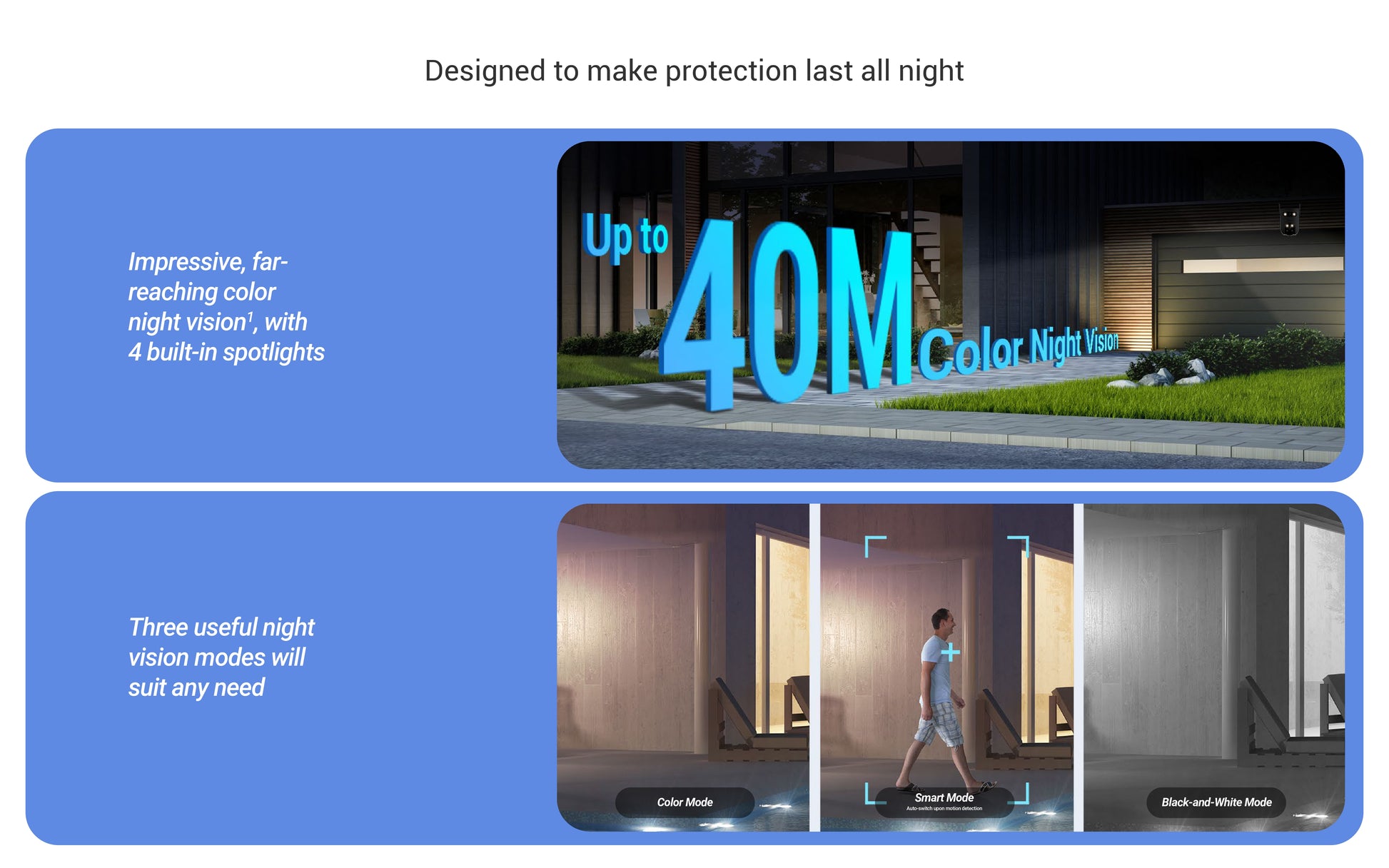 - Color Night Vision: Up to 30m (98 ft) color night vision with 4 integrated spotlights.
