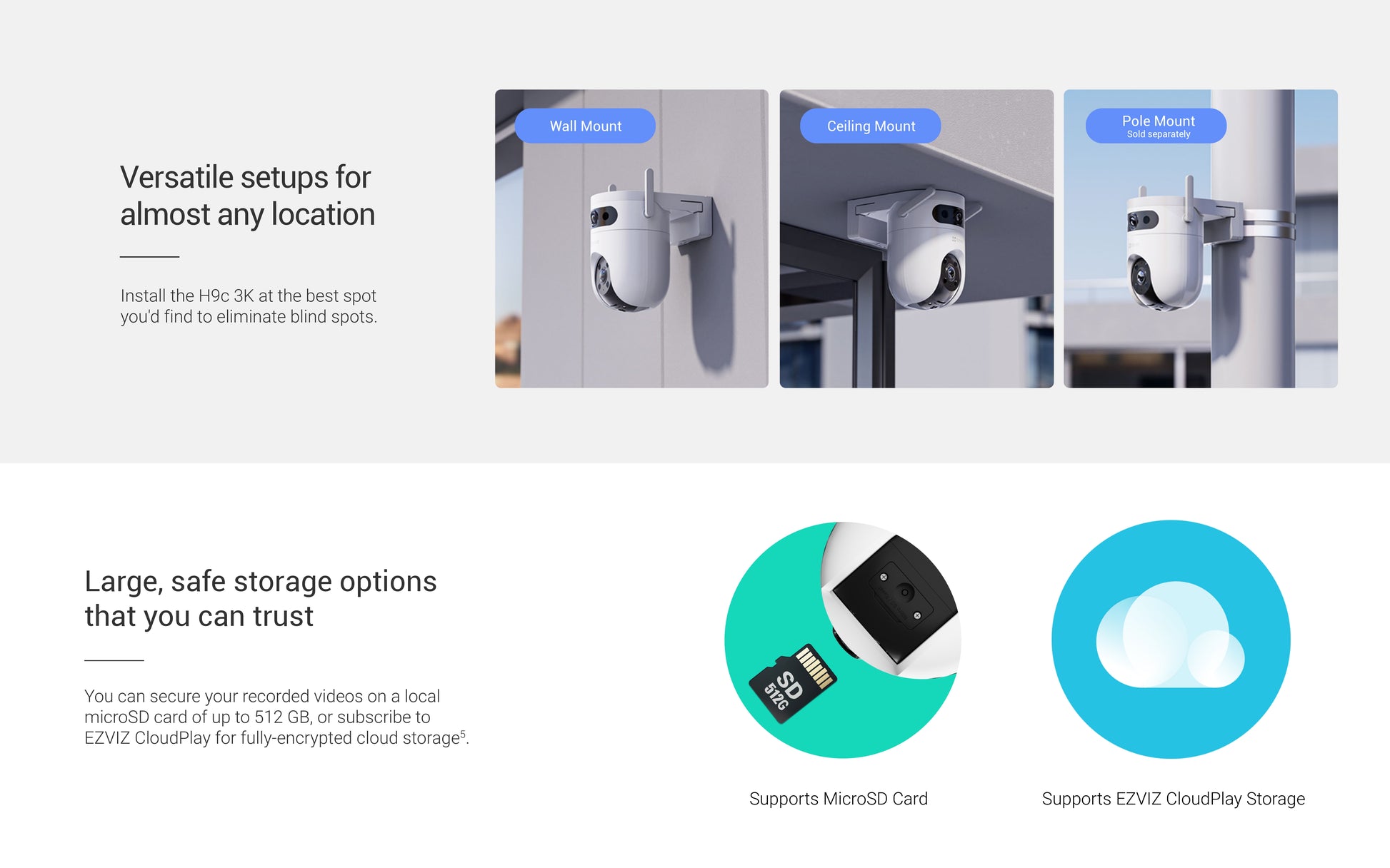 - Flexible Storage: Supports microSD cards up to 512 GB and EZVIZ CloudPlay (subscription optional).