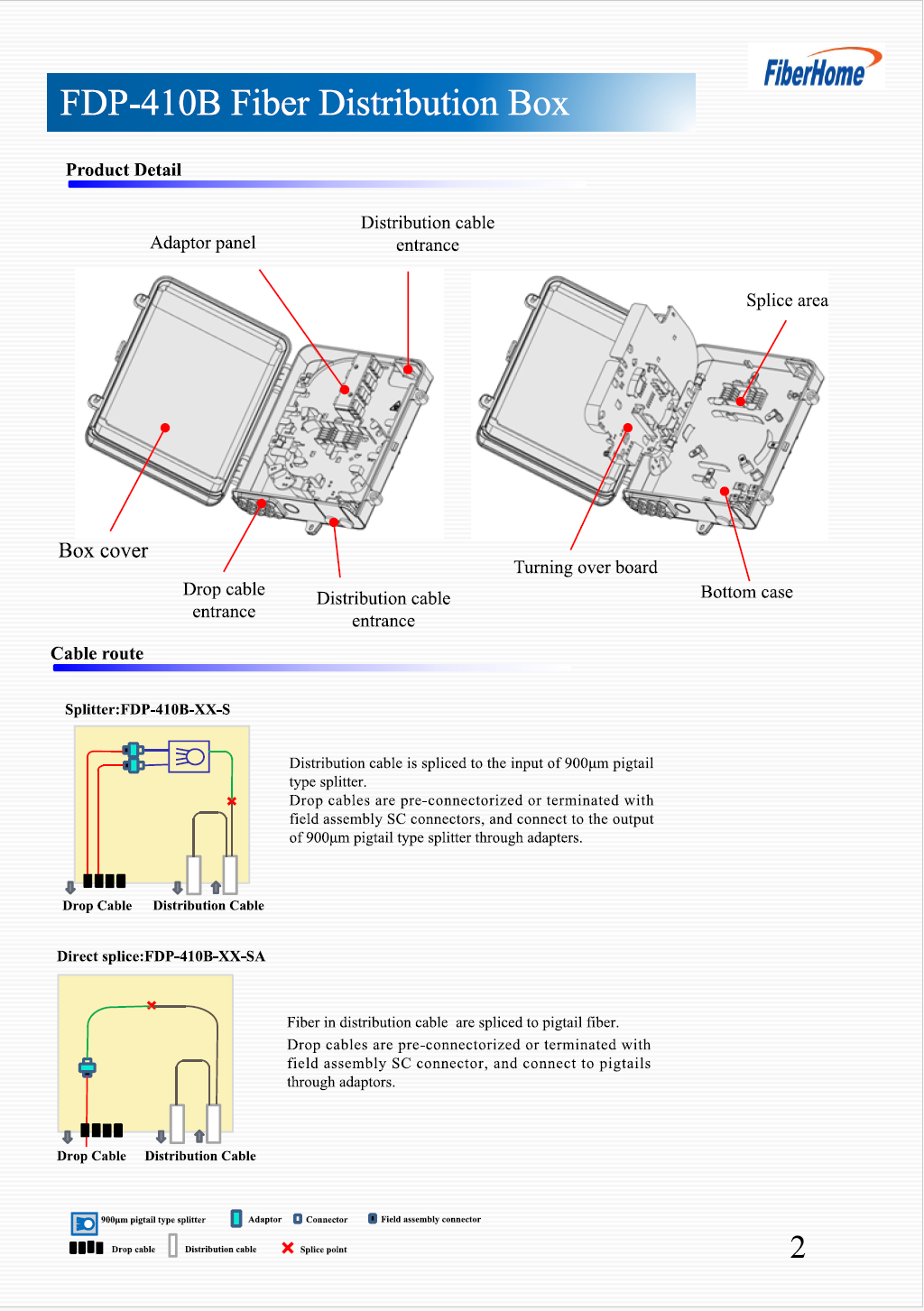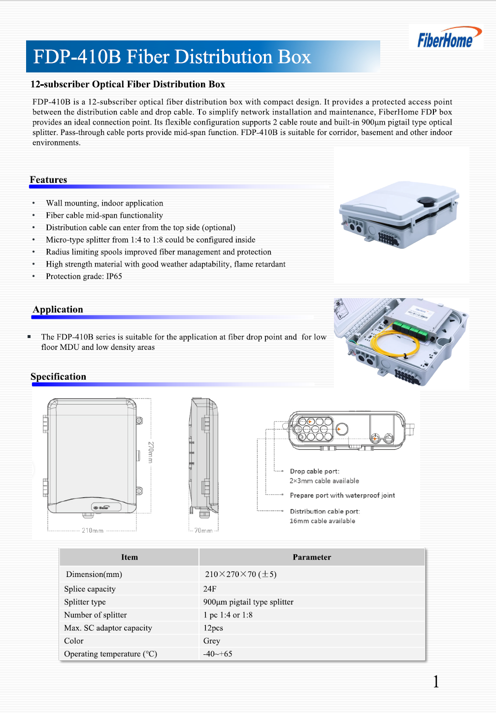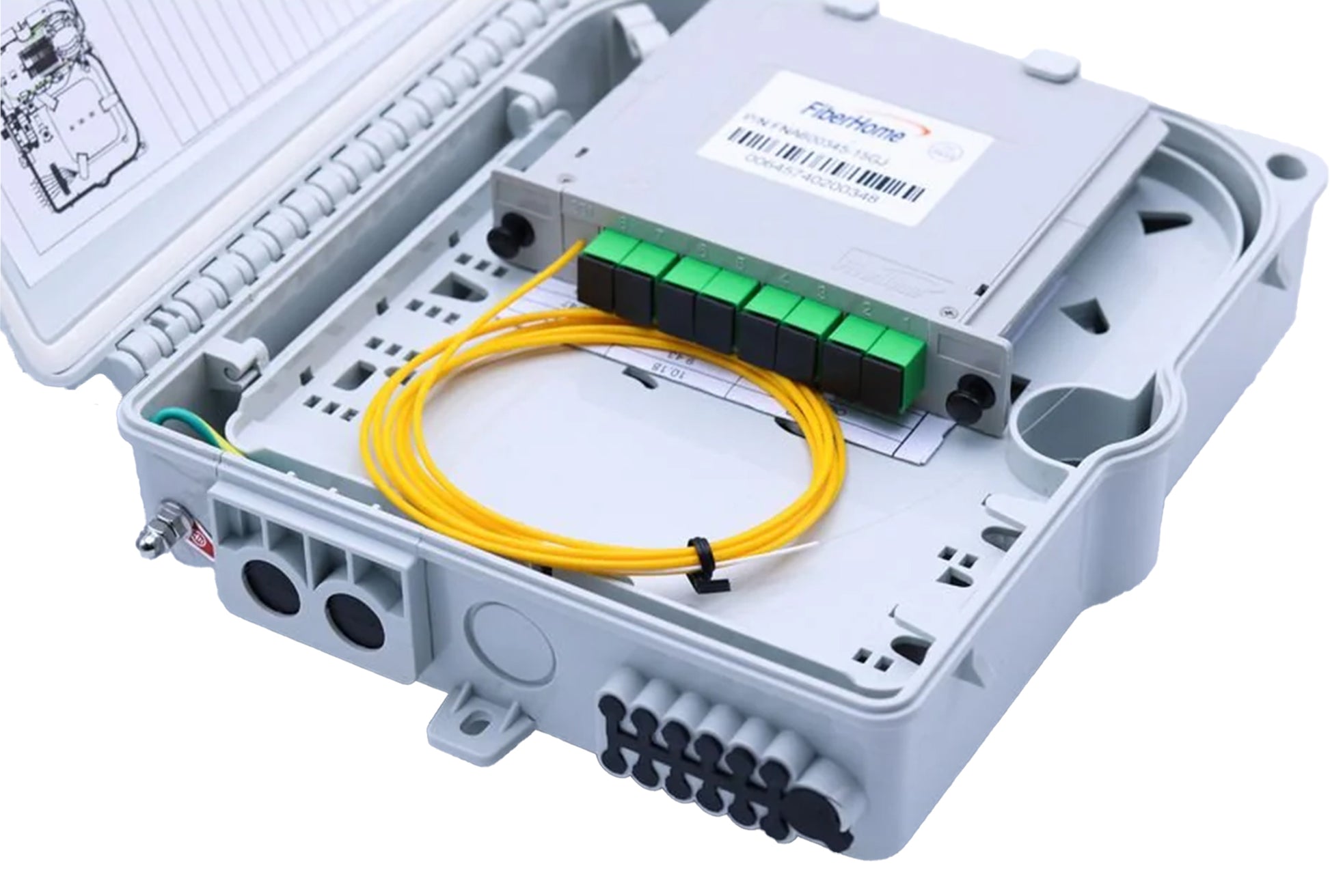 FiberHome FDP-410B Fiber Distribution Box – 24 Fiber Splice Capacity, 1:8 Splitter, Wall-Mount, IP65, Indoor Use, 210×210×70mm