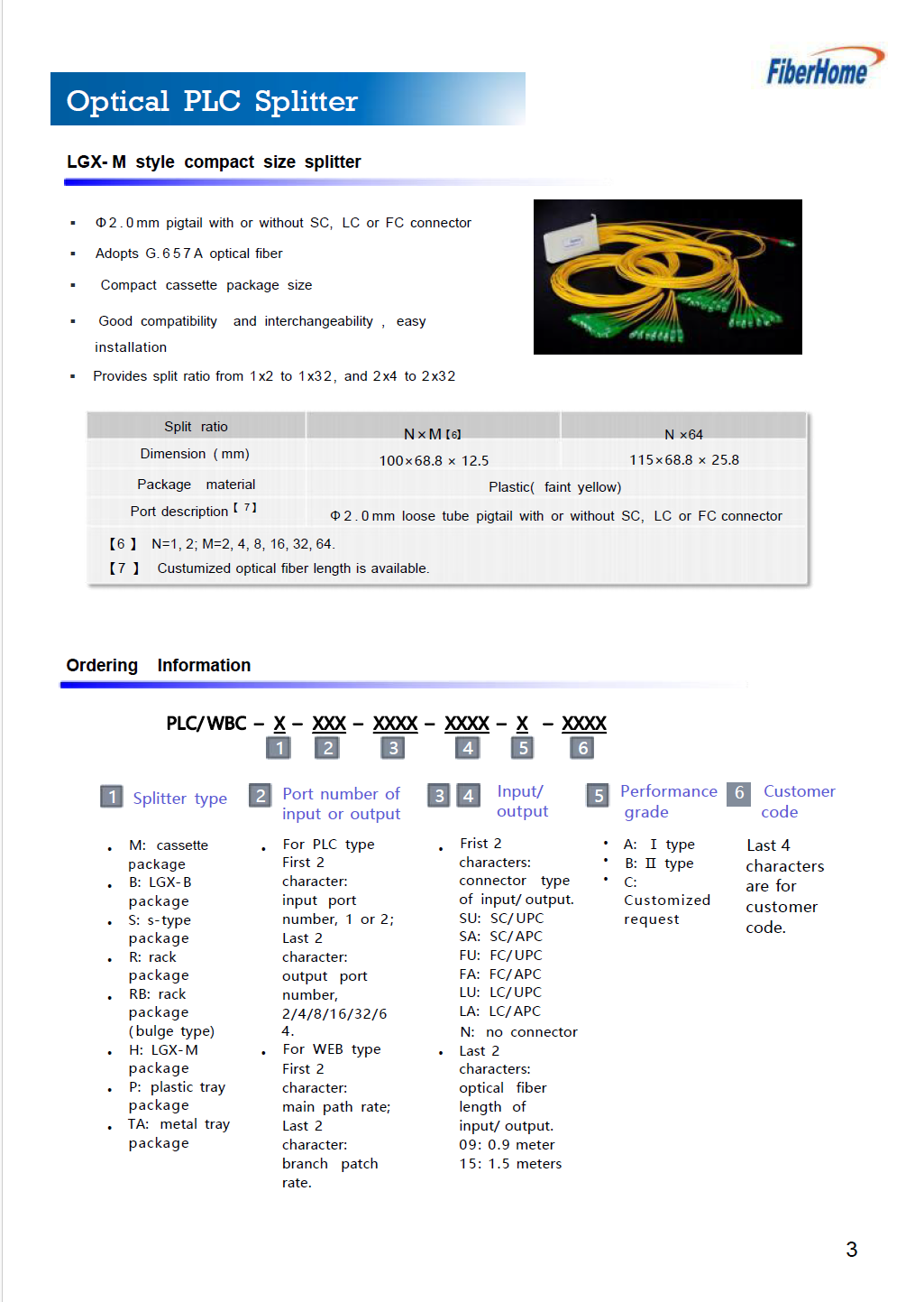 - Uses G657A single-mode fiber with φ2.0 mm pigtails or loose tube