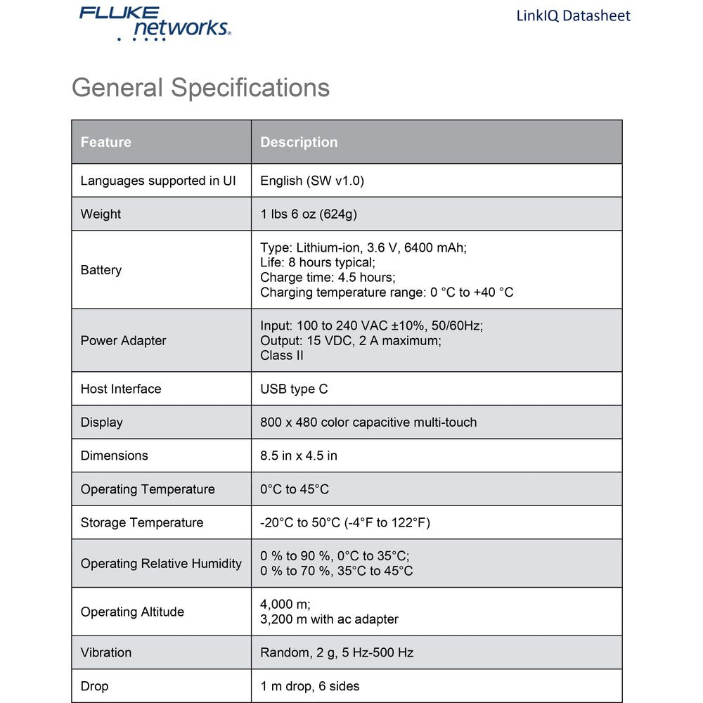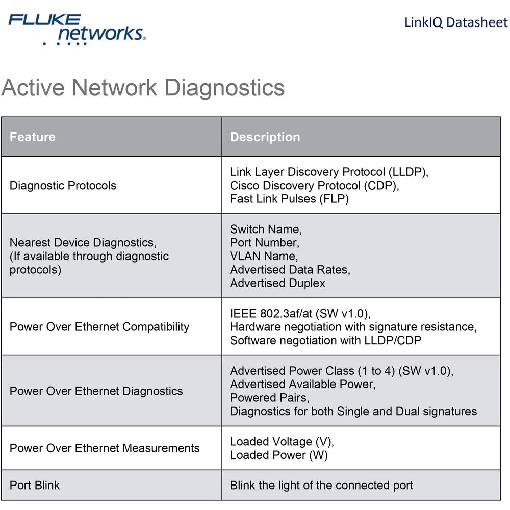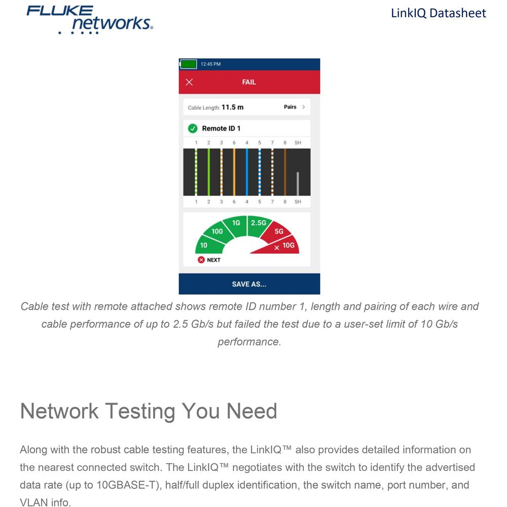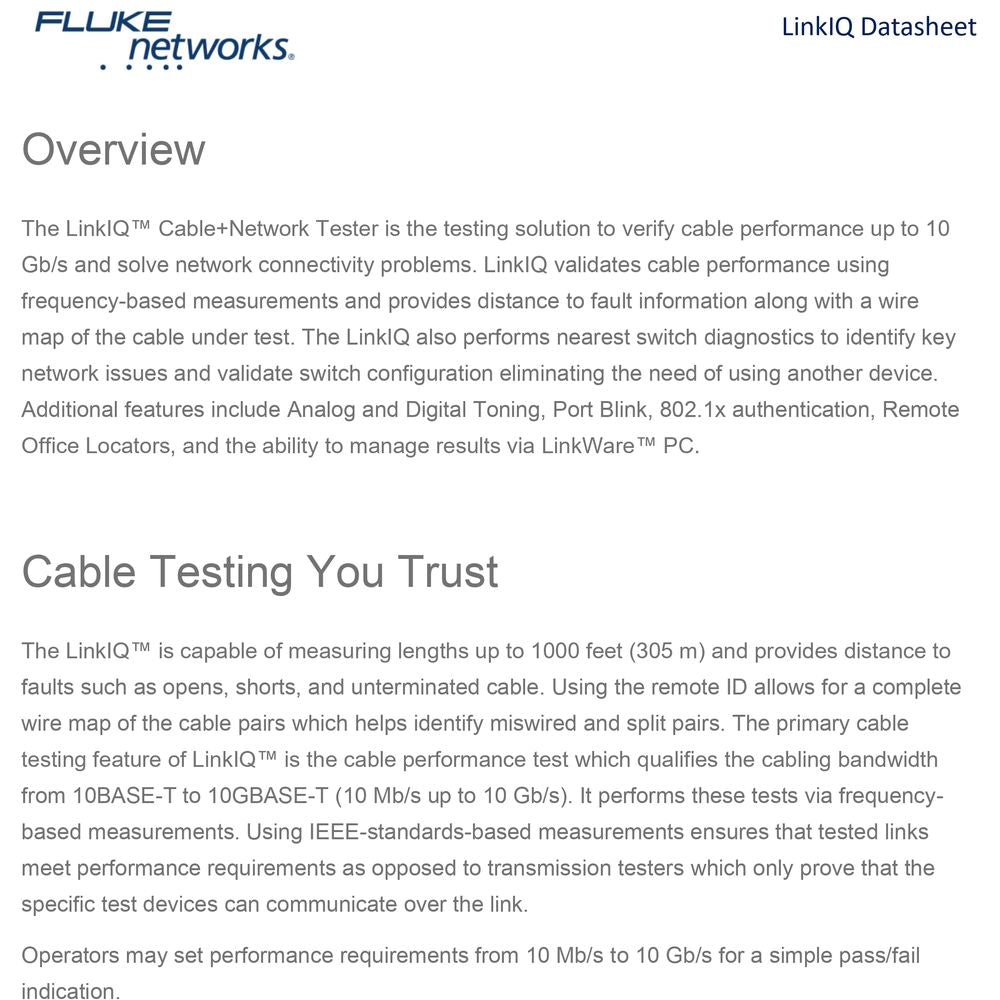 The Fluke Networks LinkIQ™ Cable+Network Tester is the ideal solution to verify cable performance up to 10 Gb/s and troubleshoot network connectivity issues. It combines cable performance validation using frequency-based measurements with switch diagnostics, helping professionals identify key issues quickly.