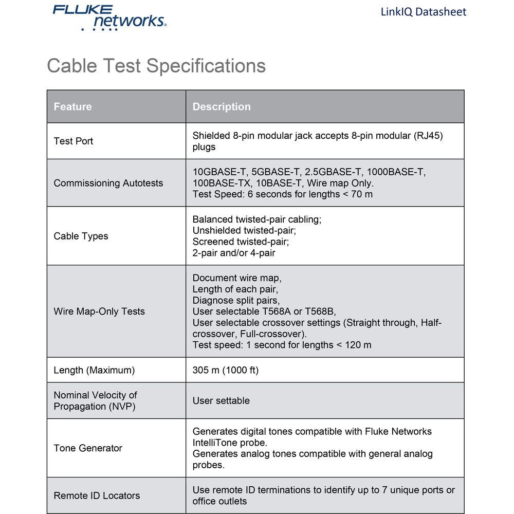 - Verifies cable performance up to 10 Gb/s (10GBASE-T)