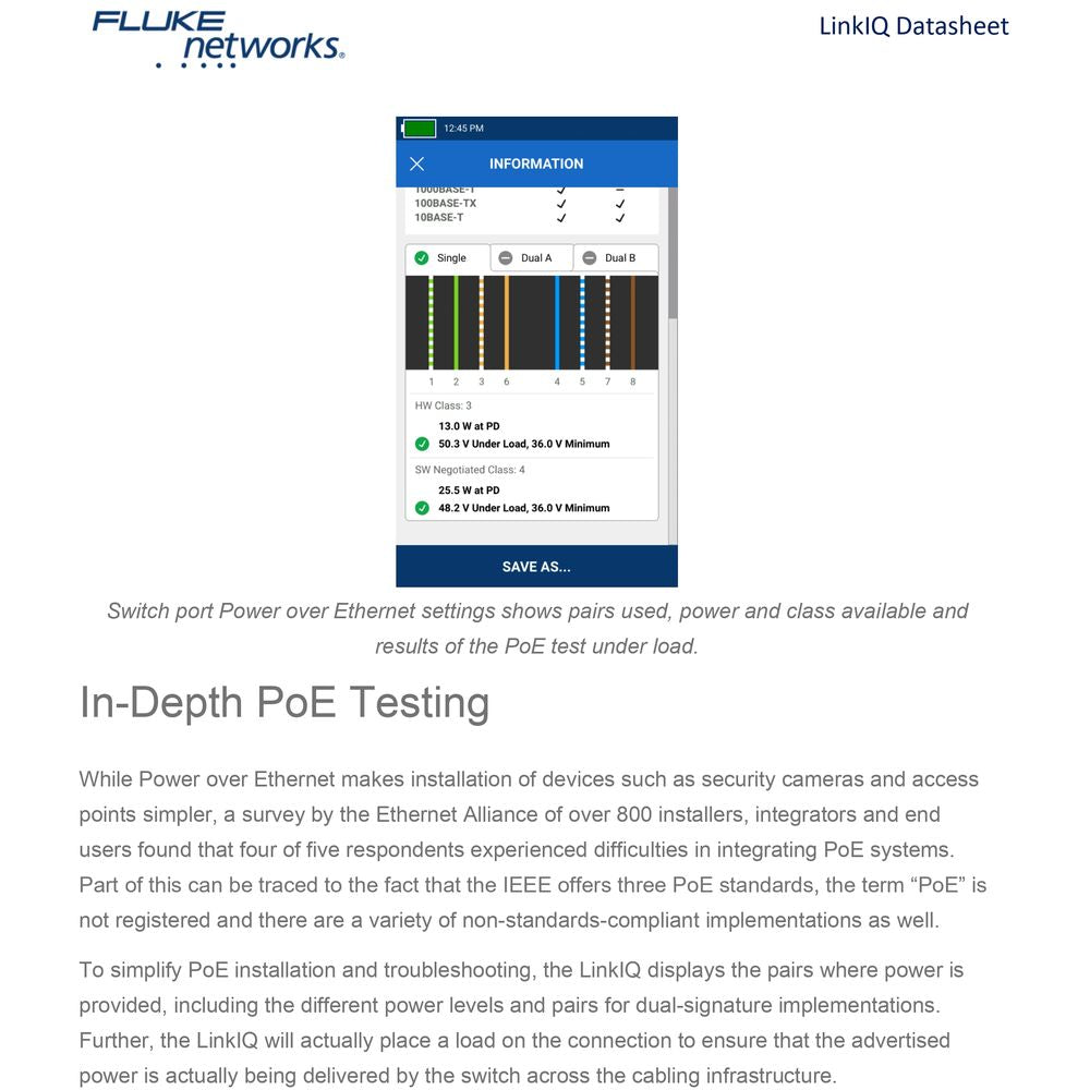 LinkIQ™ simplifies PoE troubleshooting by detecting which wires provide power, measuring voltage under load, and determining the class of PoE available. It supports single and dual-signature PoE implementations, ensuring compatibility with various standards and devices.