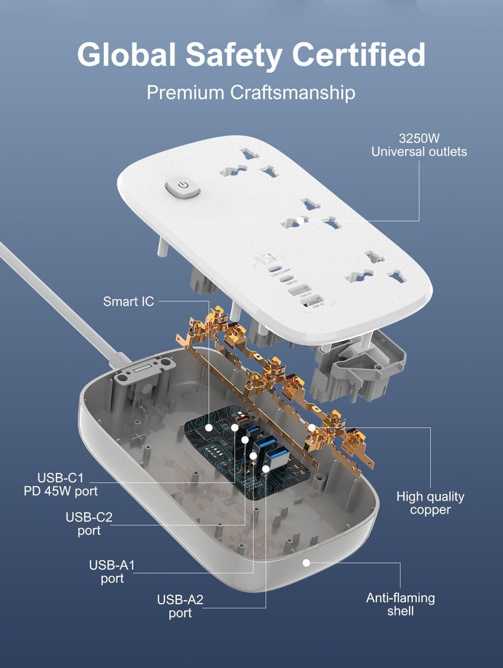 - High power capacity up to 3250W supporting 100–250V and 13A devices