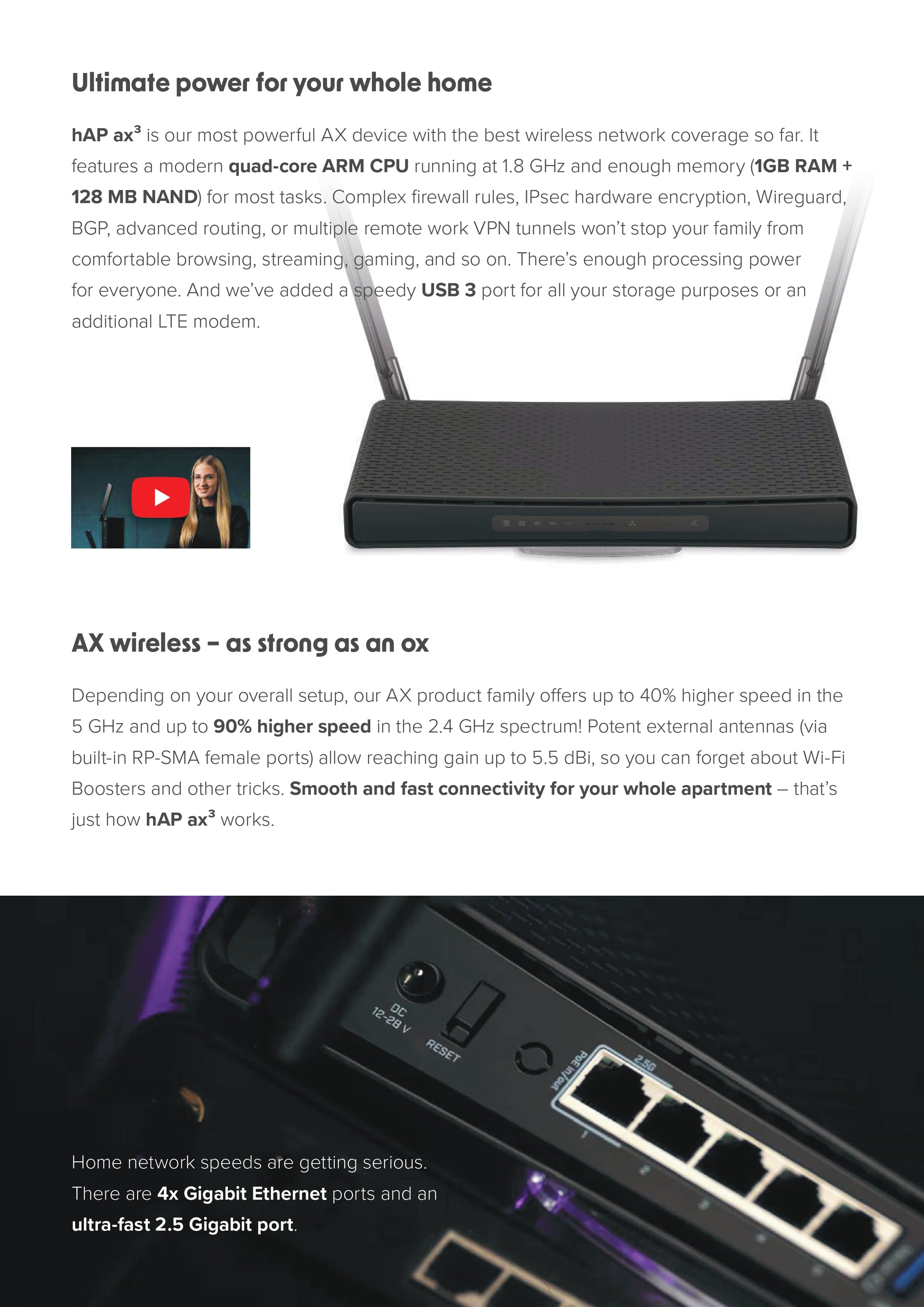 hAP ax³ is our most powerful AX device with the best wireless network coverage so far. It features a modern quad-core ARM CPU running at 1.8 GHz and enough memory (1GB RAM + 128 MB NAND) for most tasks. Complex firewall rules, IPsec hardware encryption, Wireguard, BGP, advanced routing, or multiple remote work VPN tunnels won’t stop your family from comfortable browsing, streaming, gaming, and so on. There’s enough processing power for everyone. And we’ve added a speedy USB 3 port for all your storage purposes or an additional LTE modem.