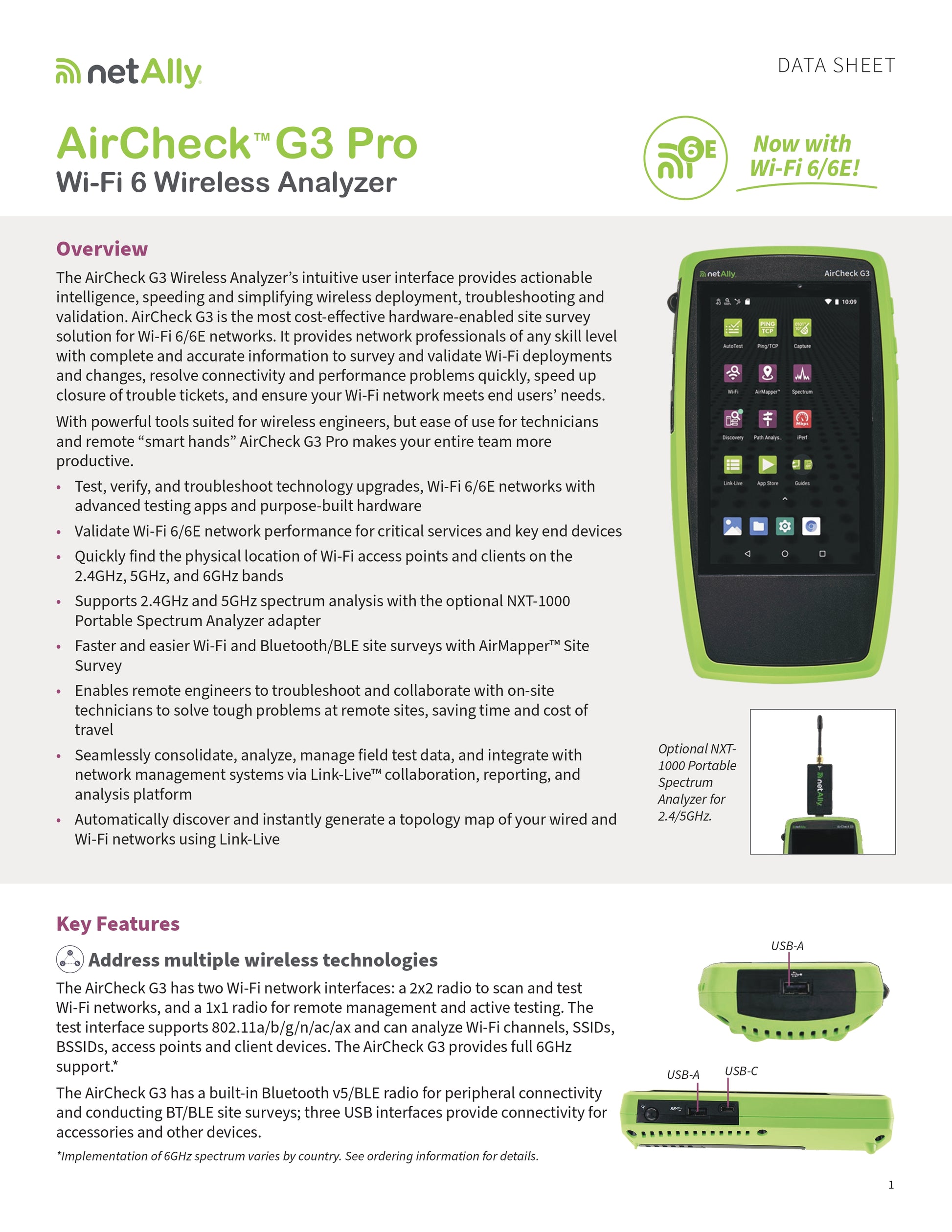 The NetAlly AirCheck G3 Pro is a powerful handheld wireless tester that helps network professionals efficiently validate and troubleshoot Wi-Fi 6 and 6E networks. With its intuitive user interface, in-depth diagnostic capabilities, and seamless integration with Link-Live cloud service, the AirCheck G3 Pro is an essential tool for modern wireless environments.