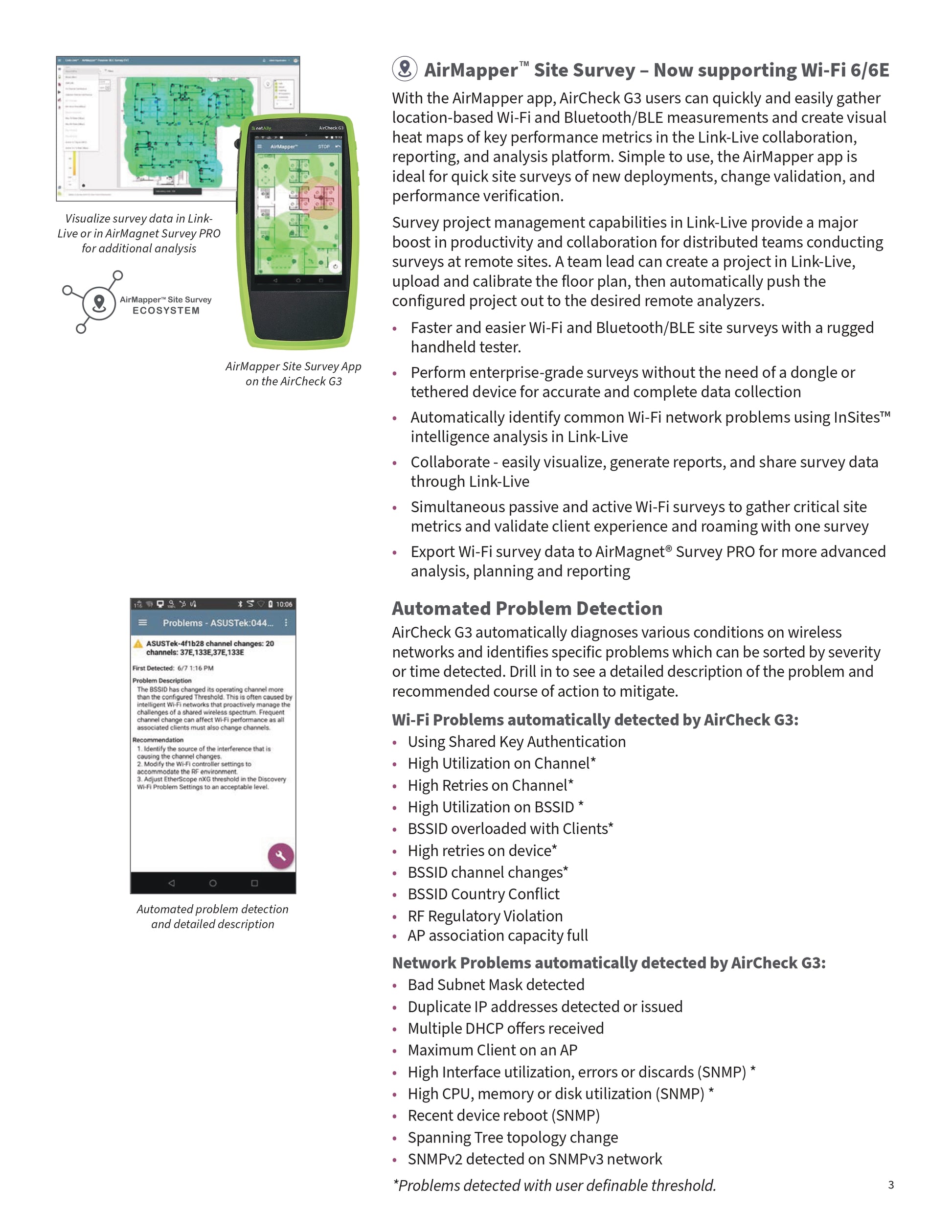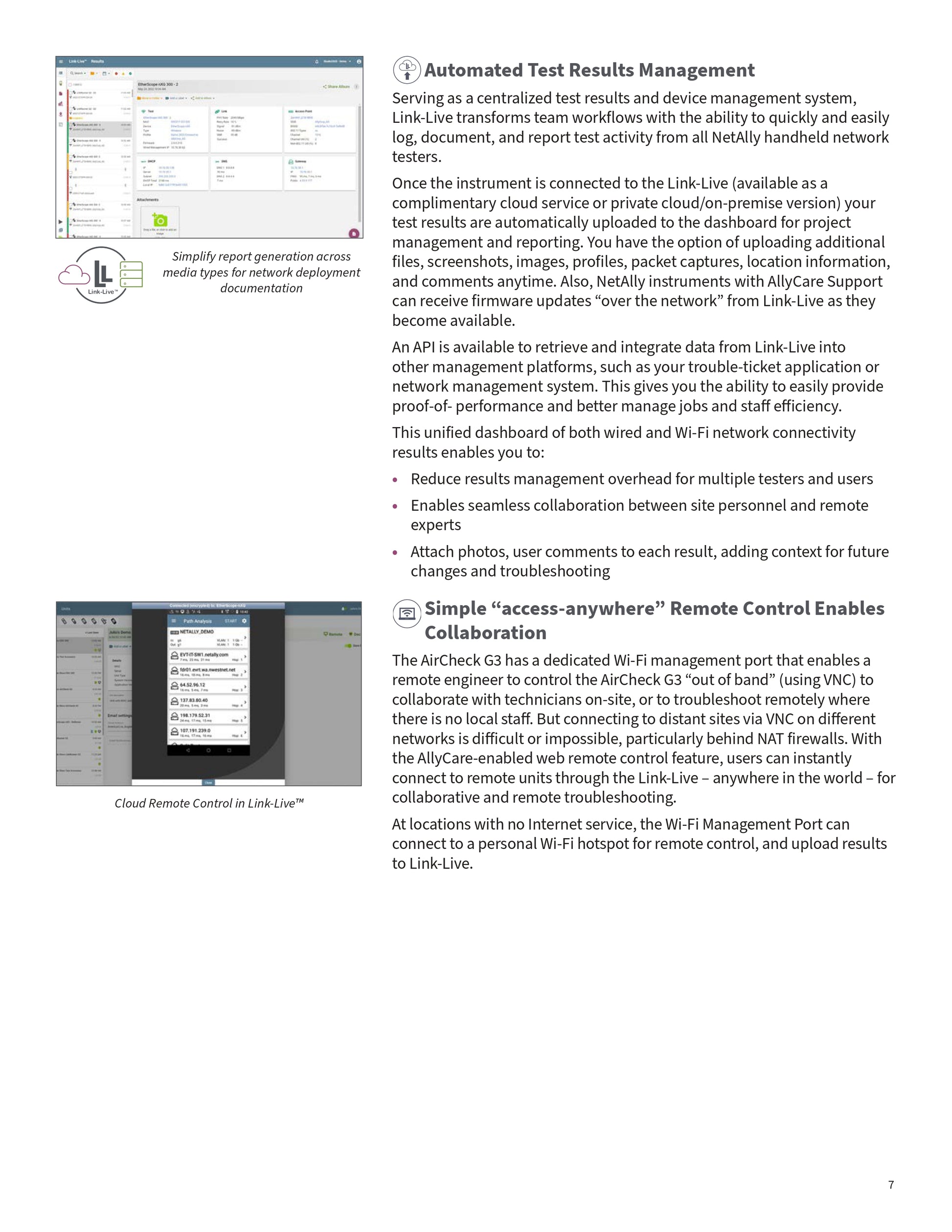 Link-Live is NetAlly’s cloud-based platform for managing test results and collaboration. With the AirCheck G3 Pro, users can automatically upload results, generate reports, view dashboards, and share findings with remote teams.