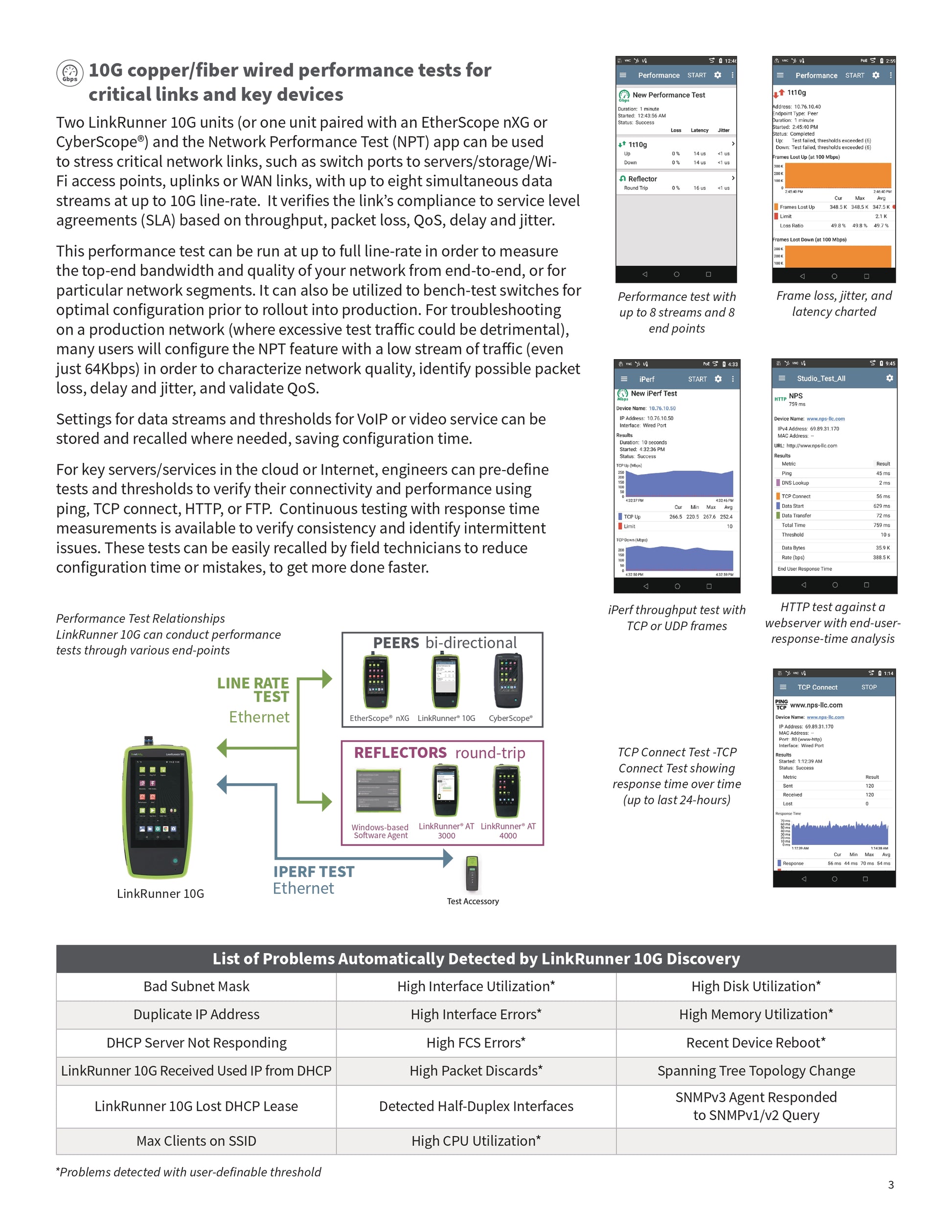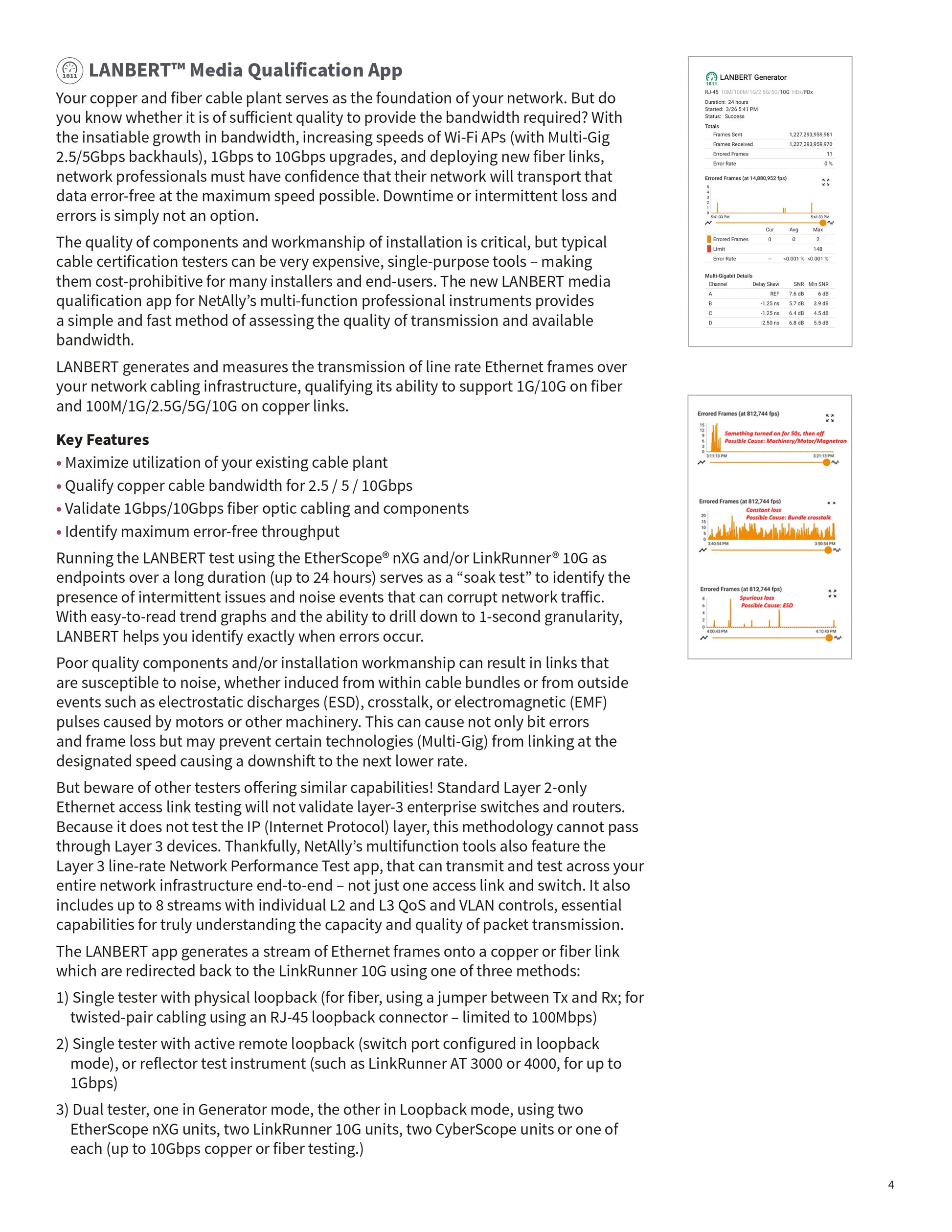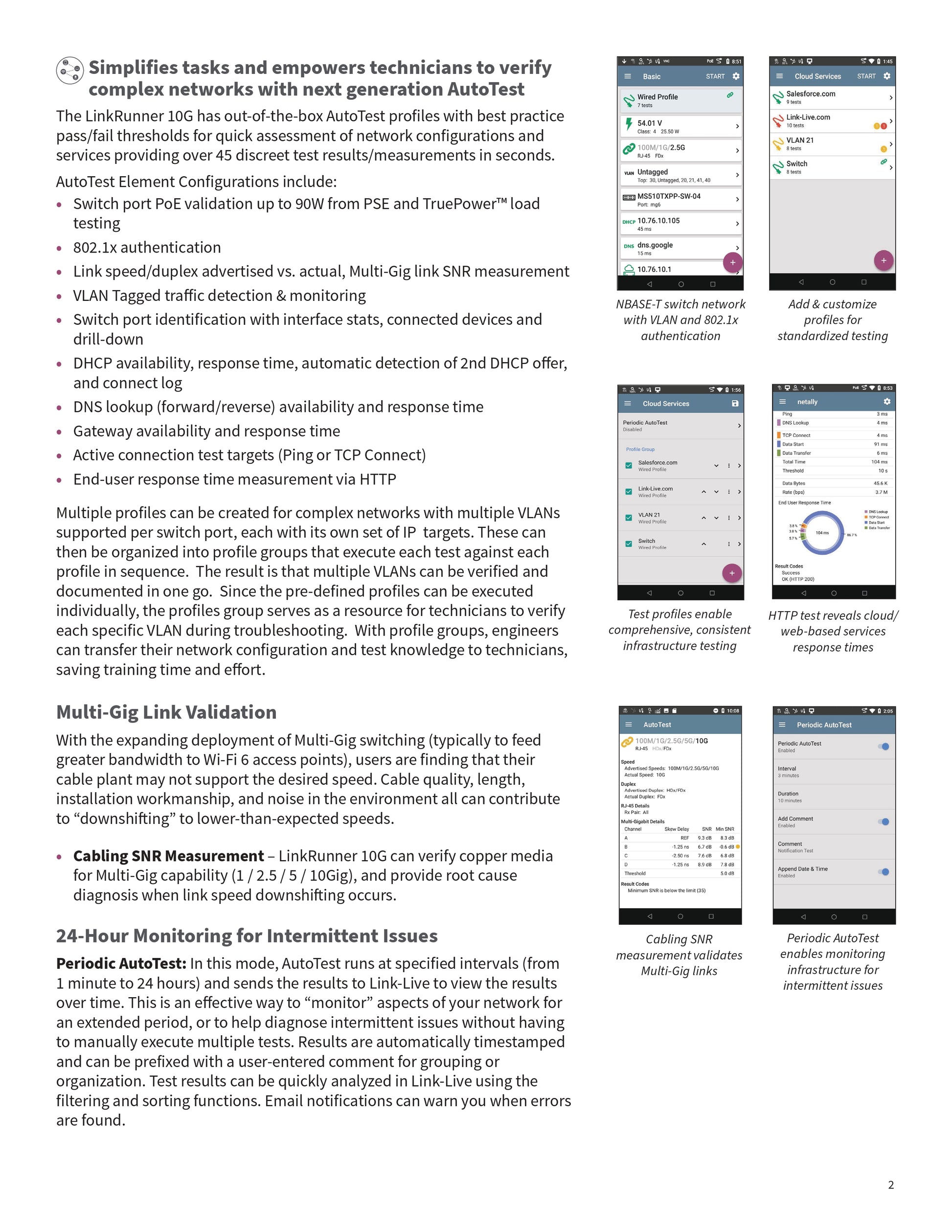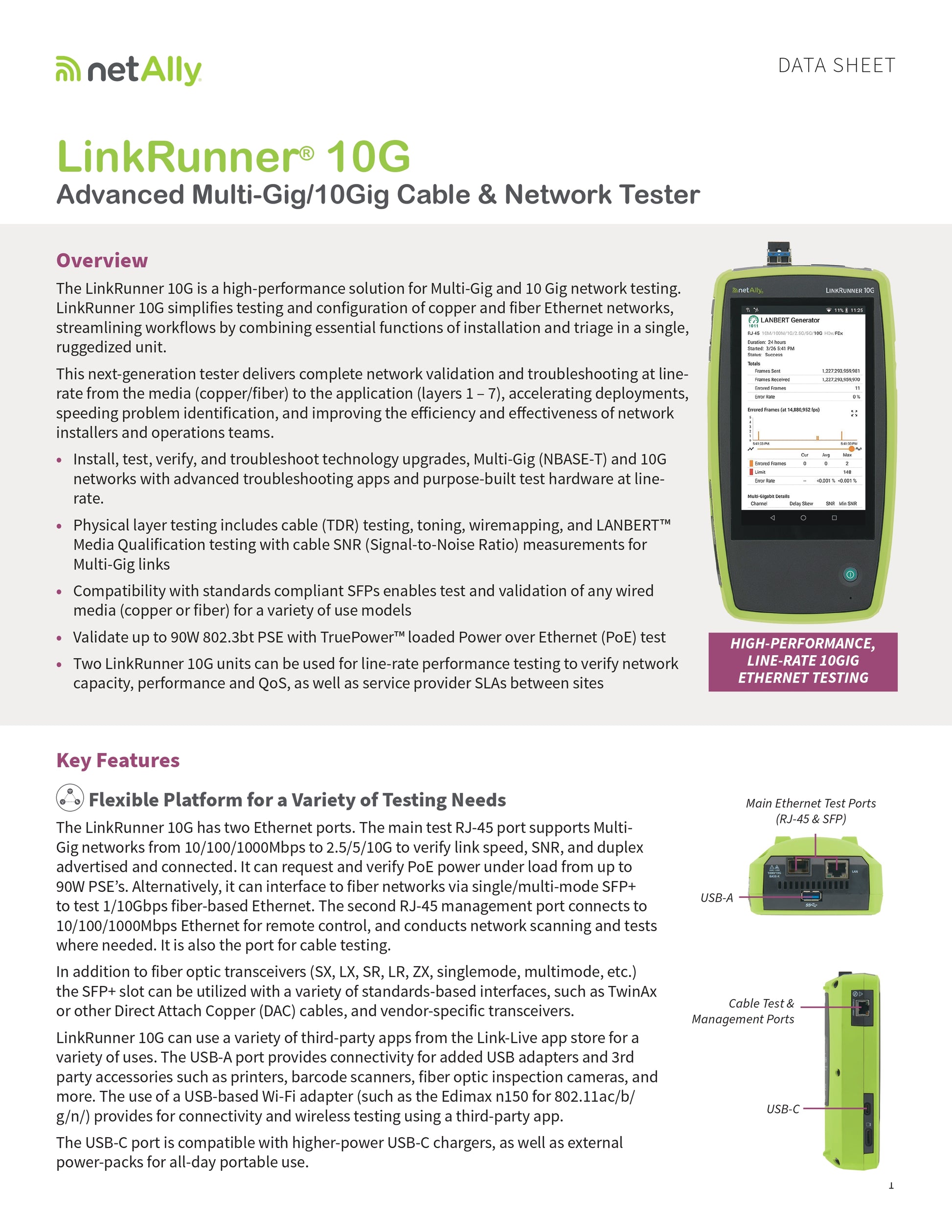 10 Gigabit Ethernet Support: With 10GBASE-T and SFP+ fiber interfaces, the LinkRunner 10G allows for high-speed testing of 10G networks, ensuring your infrastructure can handle demanding data requirements.