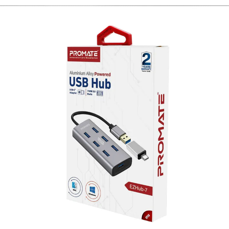 Promate 7 USB 3.0 Ports USB-A + USB-C Adaptor, 5Gbps Transfer Rate, Data & Charge