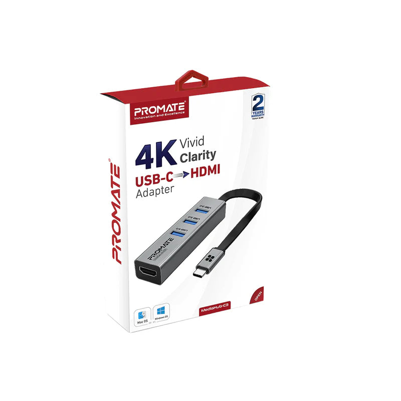 Promate MediaHub-C3 USB-C Hub HDMI Adapter with 3 USB 3.0 Ports, 5Gbps Sync Charge and 4K HDMI 30Hz Port