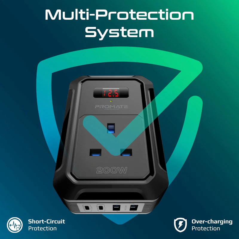 - Power up your journey with Promate’s Inverto-200W, the ultimate car companion designed for those who need reliable power on the go. With a 200W AC socket, dual ultra-fast, USB-C ports with power delivery and dual QC USB-A ports, this compact inverter charges multiple devices simultaneously, ensuring your devices are always powered and connected. The LCD digital screen keeps you informed with real-time battery voltage, while the multi-protection system safeguards your devices against short circuits, voltage fluctuations and overheating. Crafted from fire-resistant, durable materials, Inverto-200W is your safe and efficient power solution, wherever the road takes you.