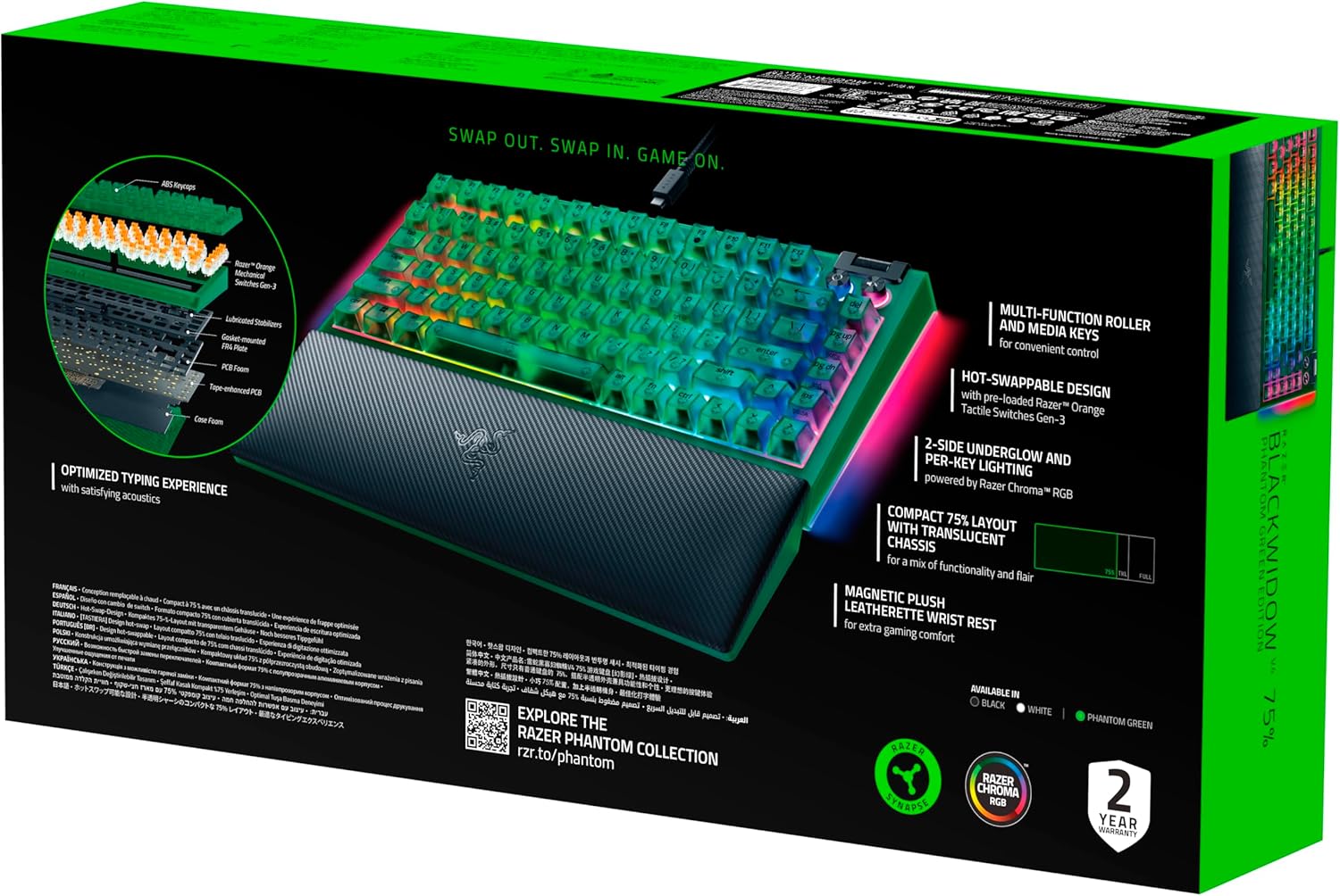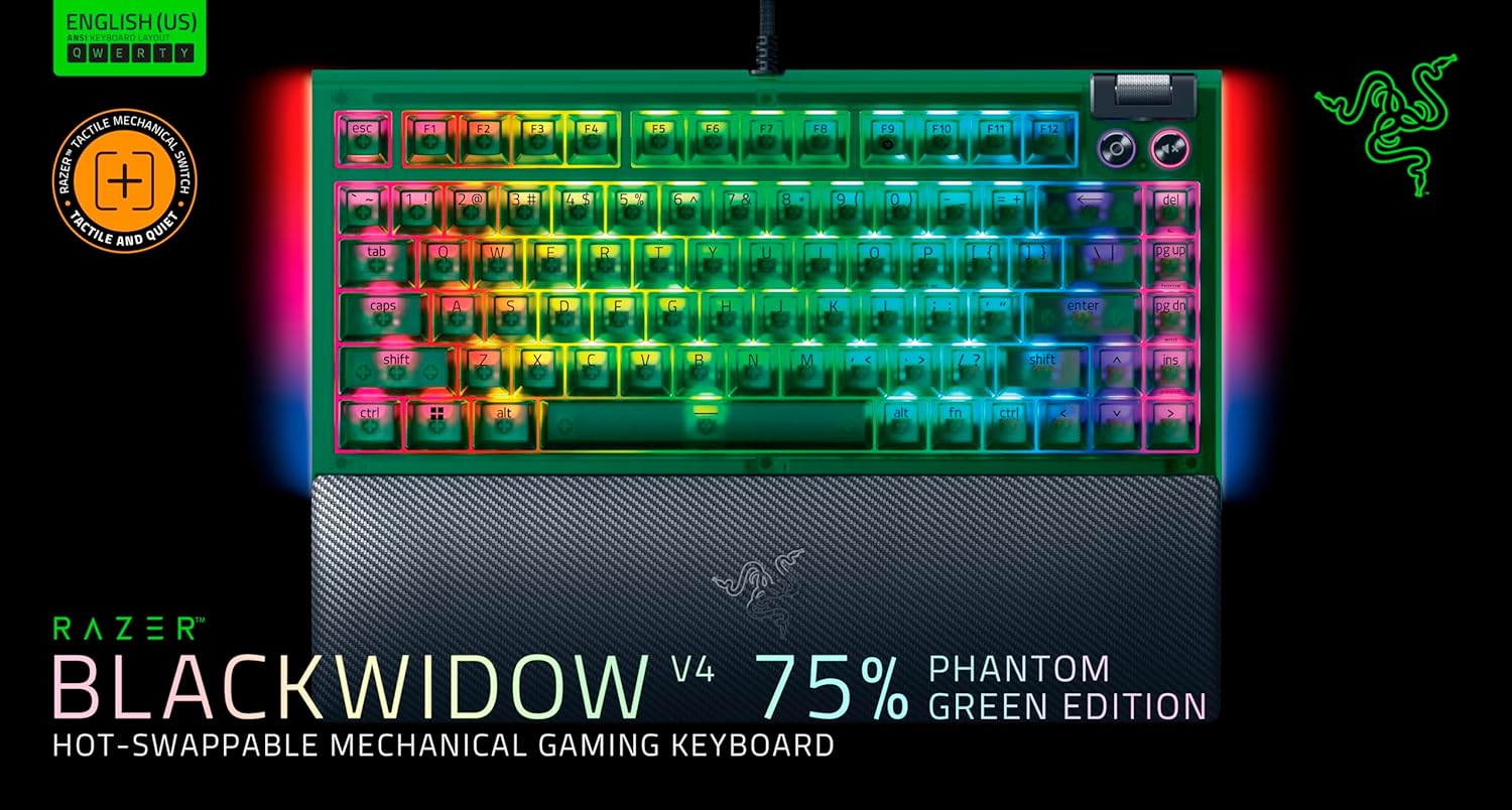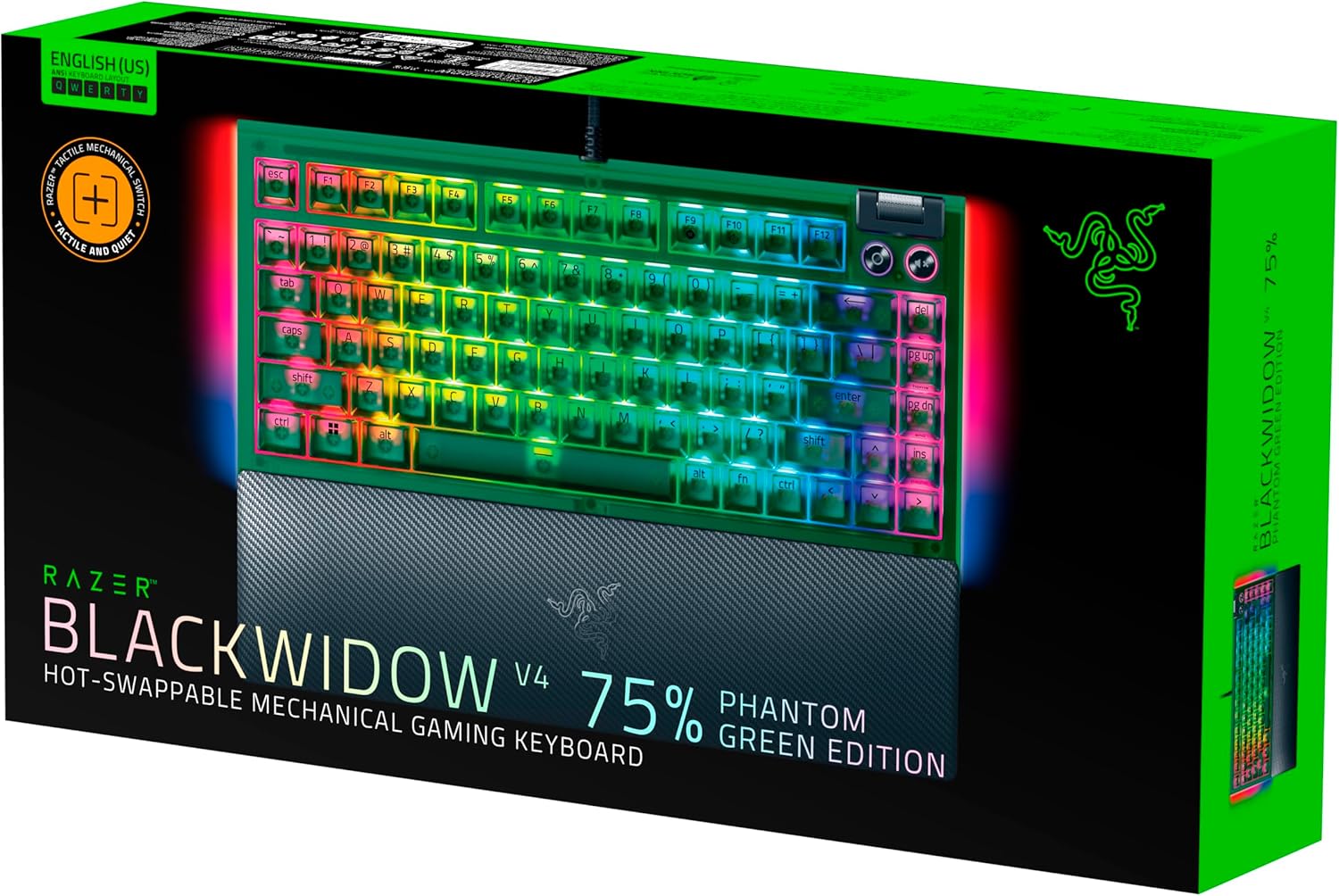 Razer BlackWidow V4 75% Phantom Green Editon - Hot-swappable Mechanical Gaming Keyboard (Orange Tactile Switches, media roller with 2 dedicated media buttons) US Layout
