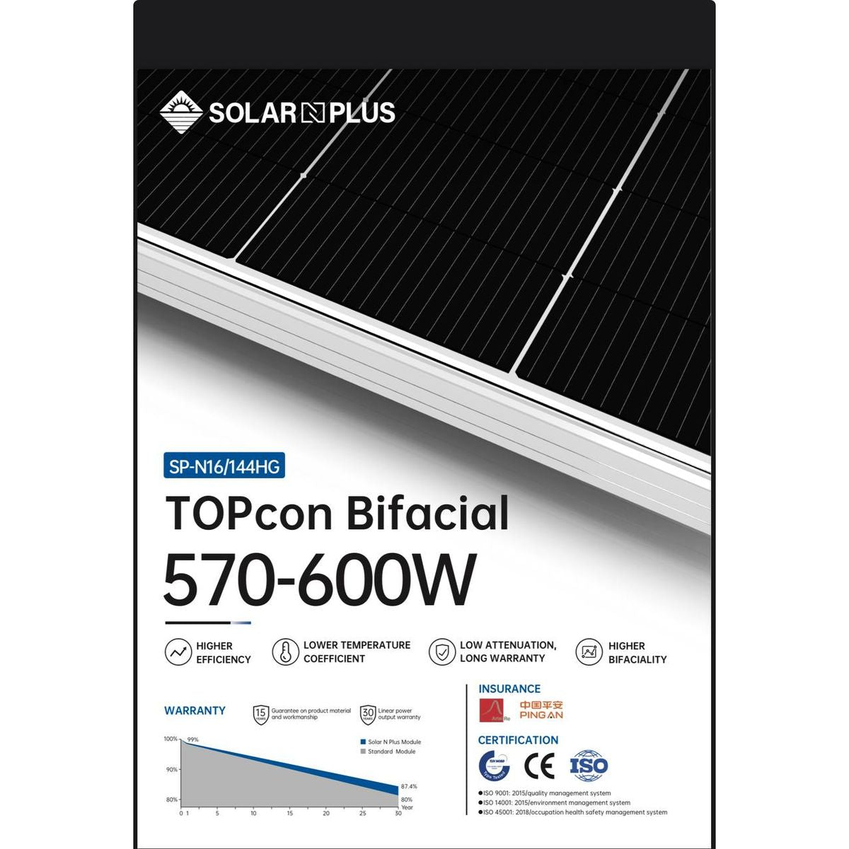 SOLAR N PLUS 580W N-Type TOPCon Solar Panel, 144 Cells, 22.5% Efficiency, 45.15V Vmpp, 12.85A Impp, 2278×1134×30mm