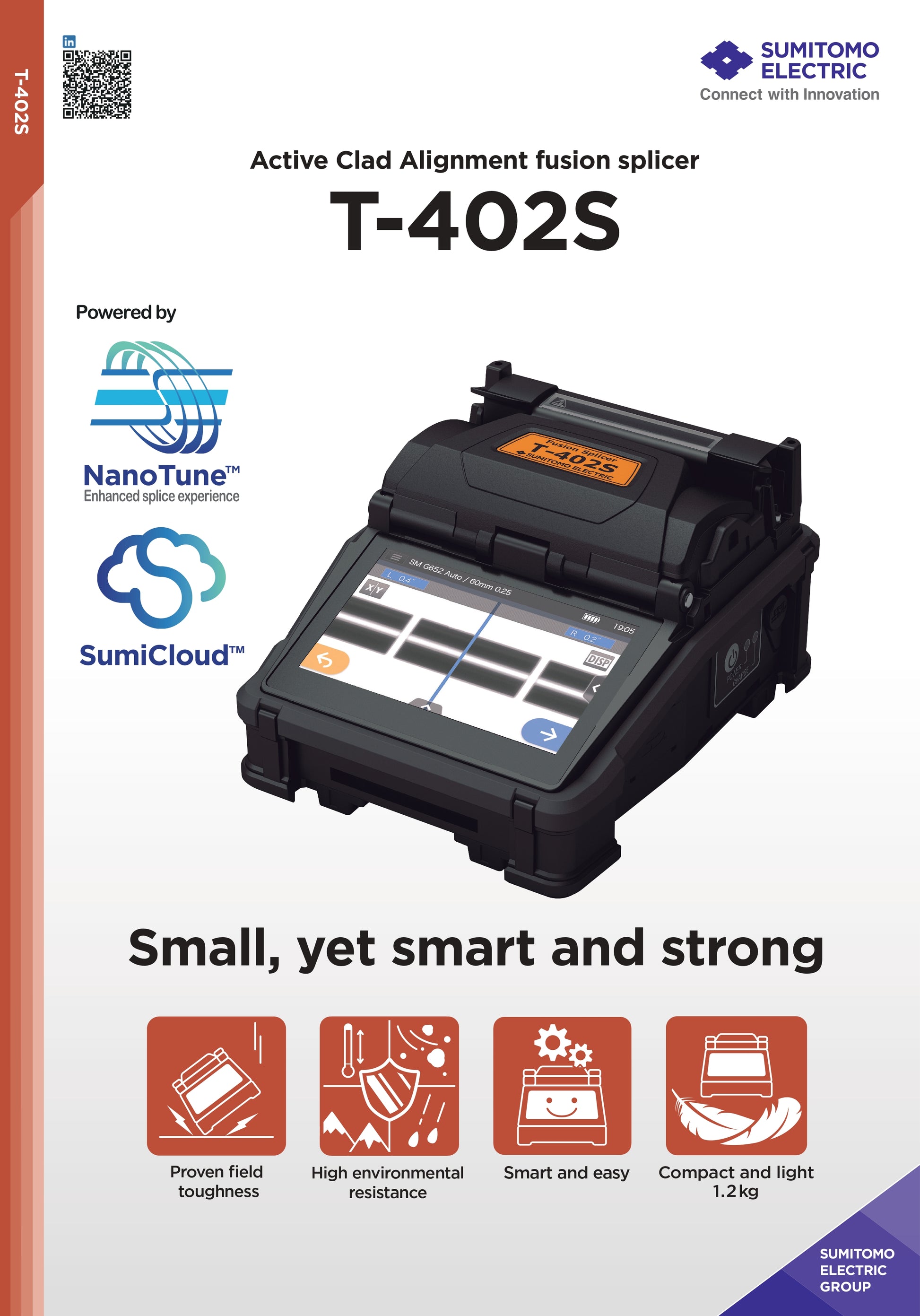 Sumitomo Electric T-402S Fusion Splicer, Active Clad Alignment, NanoTune, SumiCloud, Rugged, Lightweight 1.2kg, 4.3" LCD Display