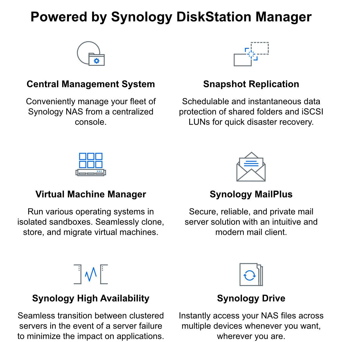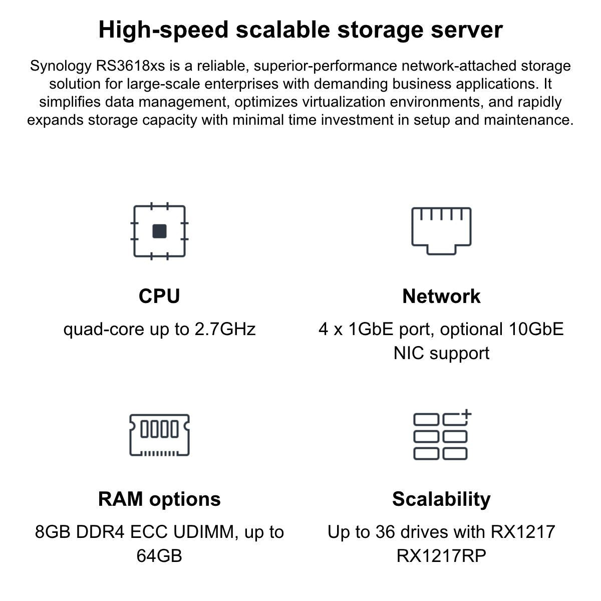 Synology RackStation RS3618xs – 12-Bay 2U NAS, Intel Xeon D-1521, 8GB DDR4 ECC (Up to 64GB), 4x 1GbE, PCIe for 10GbE, Btrfs, Scalable to 36 Drives