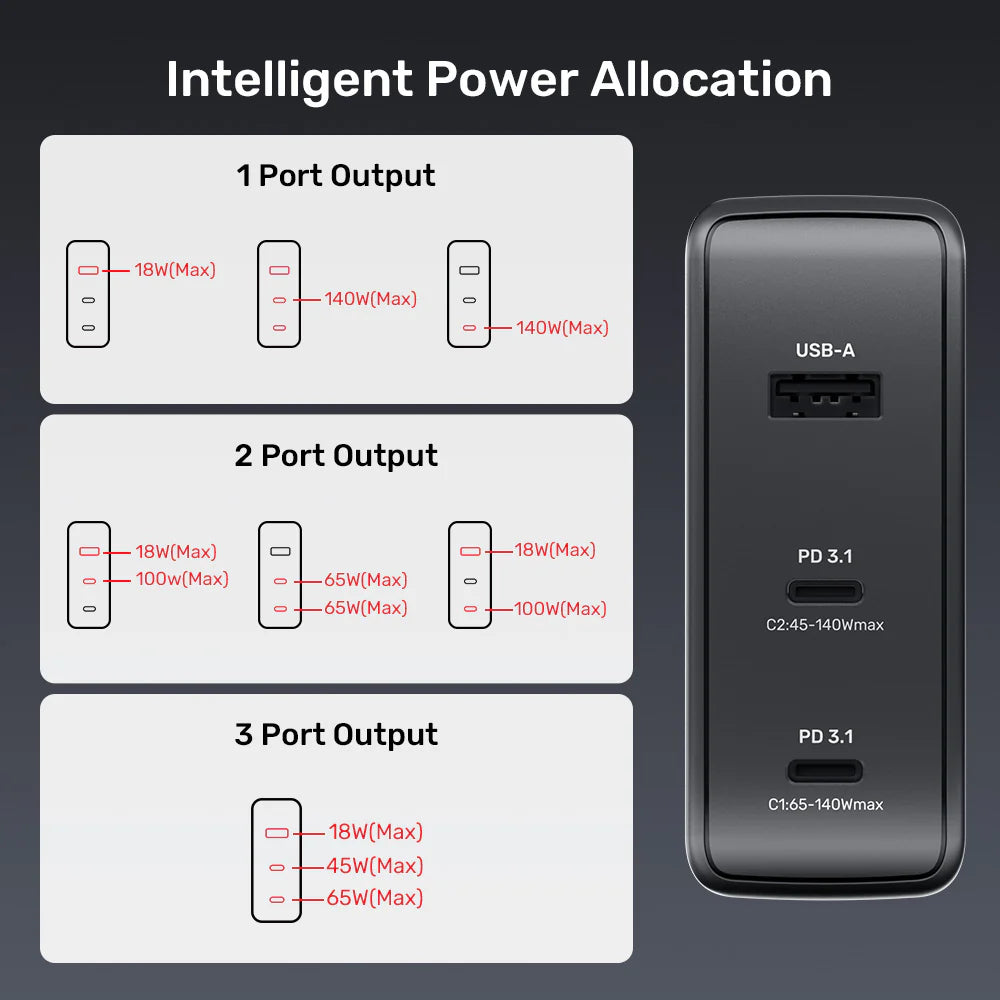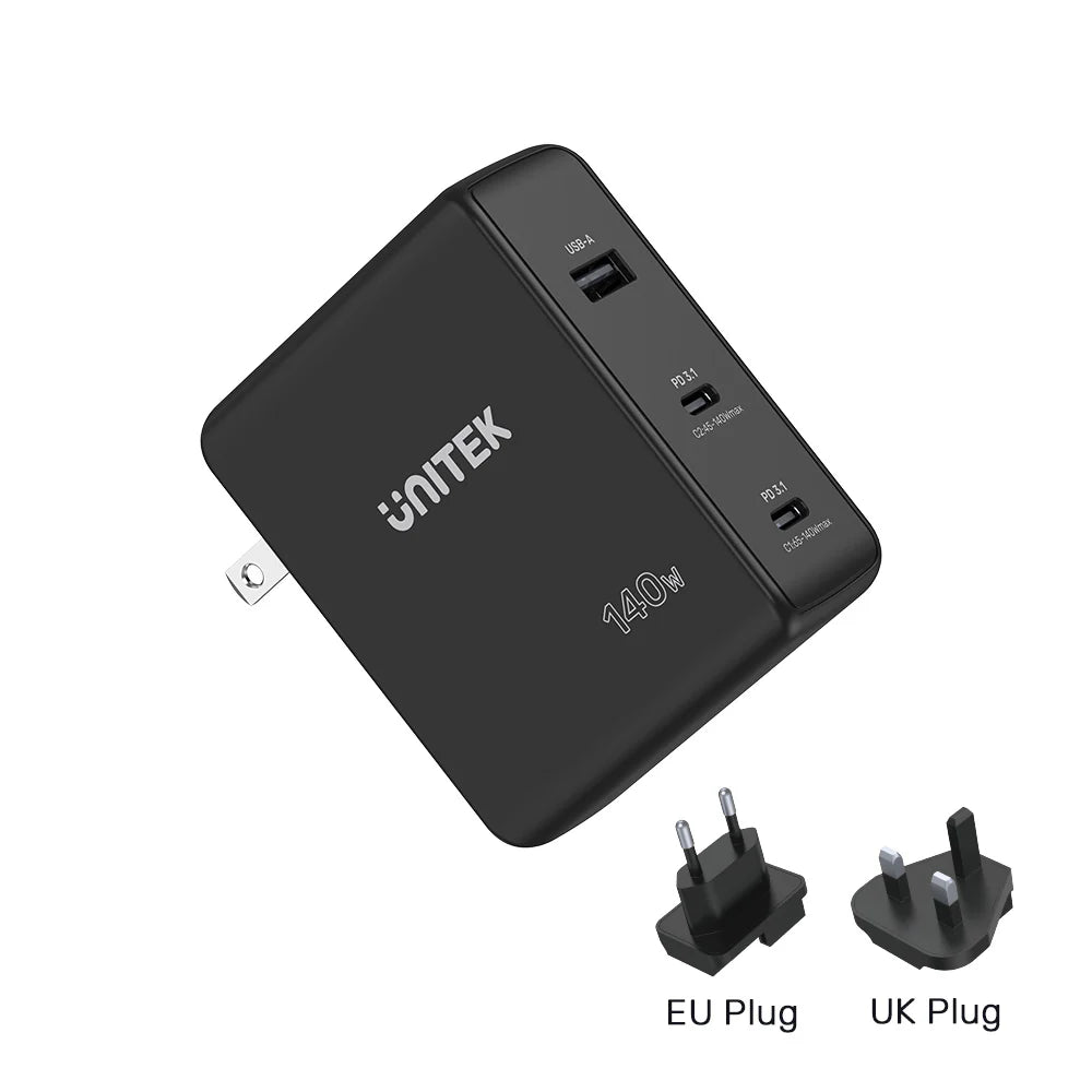 Unitek 140W GaN Wall Charger – 2× USB-C PD 3.1 & 1× USB-A Ports - Fast Charging for MacBook Pro - Compact Design - Includes EU & UK Plugs
