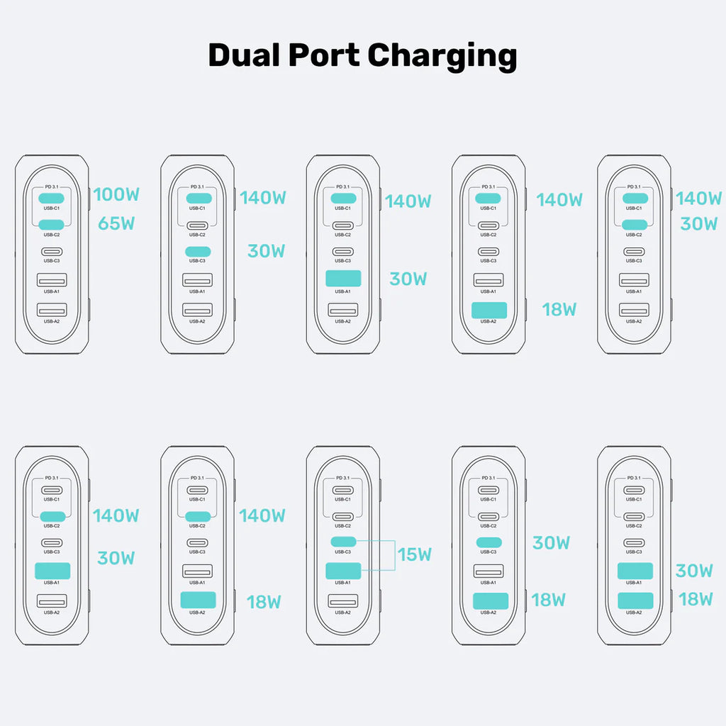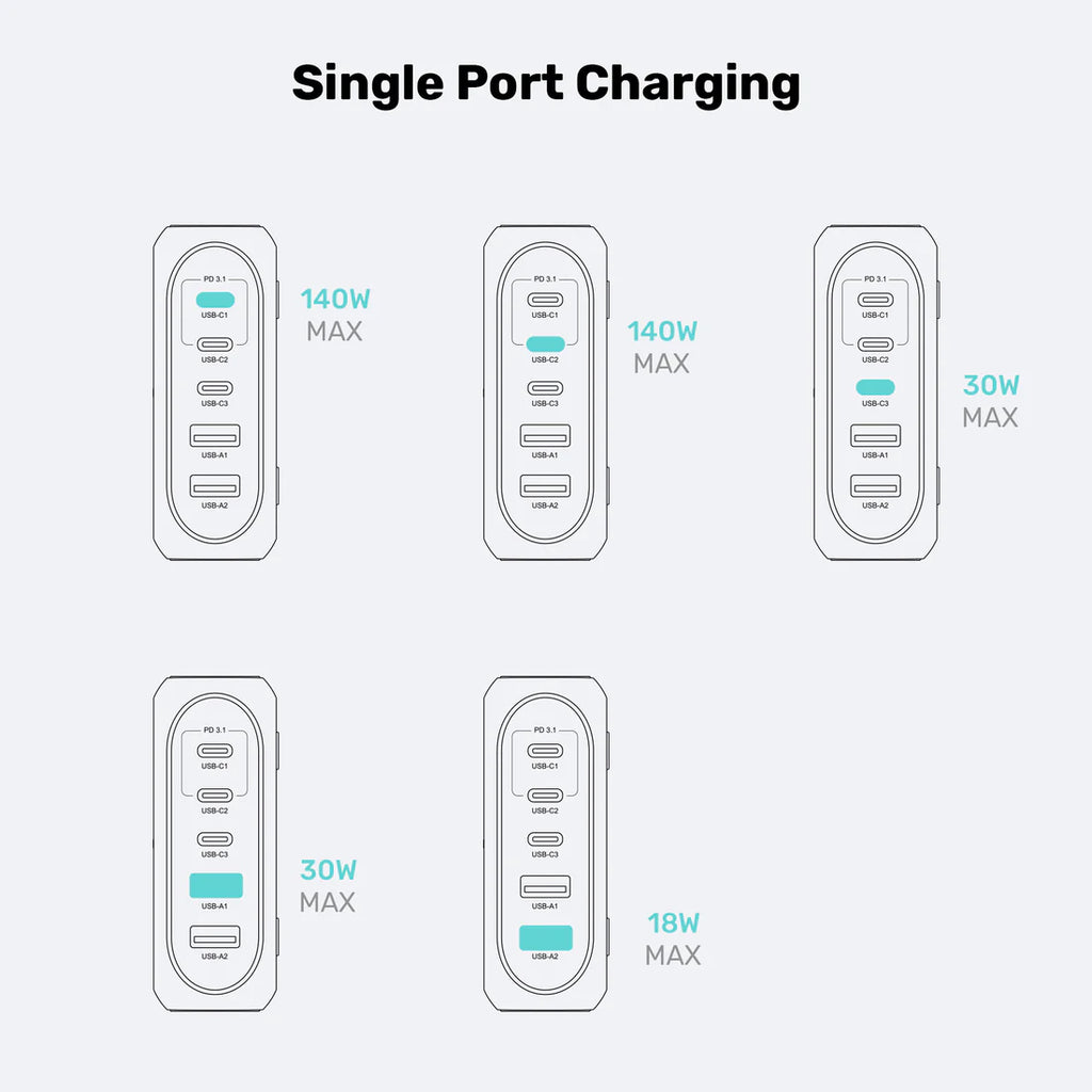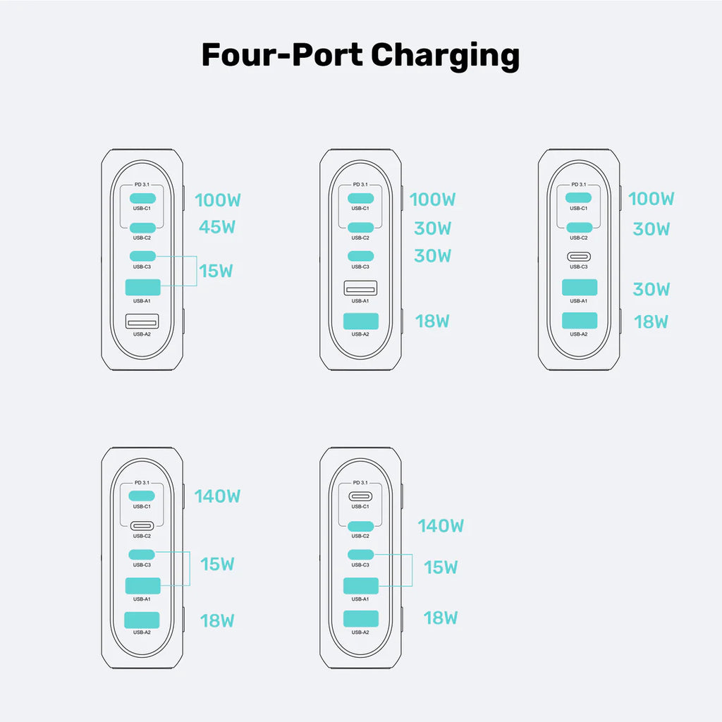 Single port: up to 140 W USB-C + 15 W + 18 W depending on configuration.