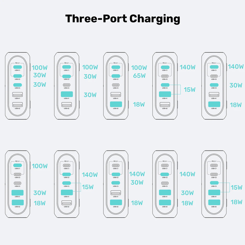 Three-port mode: examples include 100 W + 30 W + 18 W or 140 W + 15 W + 18 W.