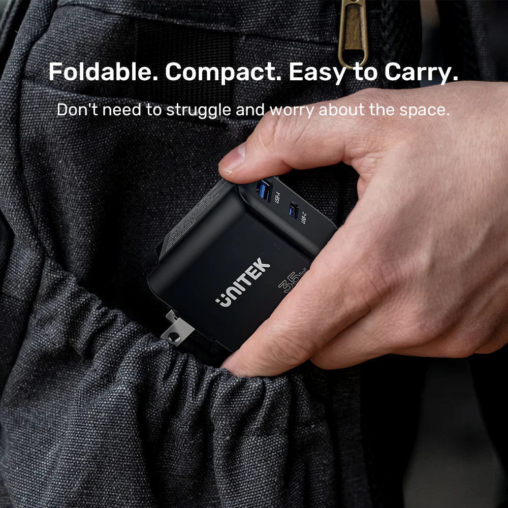 - Design: Ultra-compact, 60% smaller than standard 35W USB-C chargers; foldable plug for portability