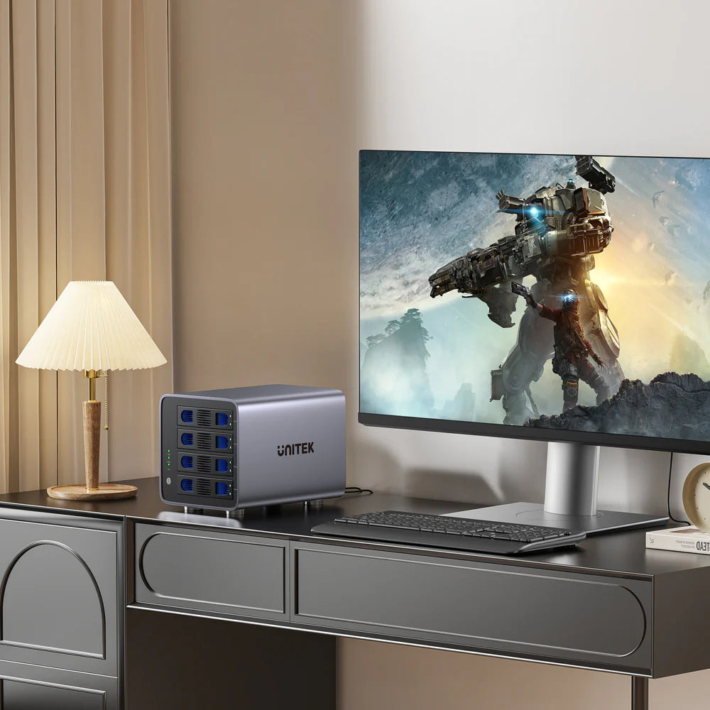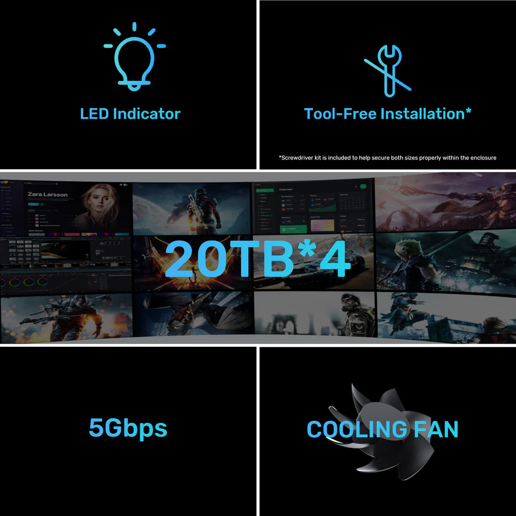 Drive Compatibility: Supports up to four 2.5″ or 3.5″ SATA HDDs/SSDs, with total storage capacity up to 80 TB.