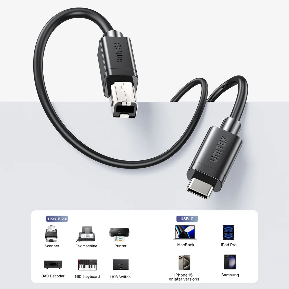 UNITEK USB-C to USB-B Data & Charging Cable – 480Mbps, Triple EMI Shielding, PVC Jacket Compatible with Printers, Scanners & Audio Gear