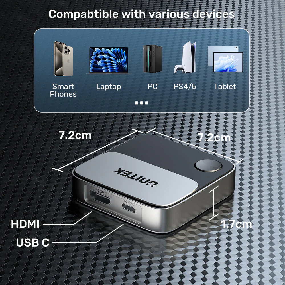 - Ports Included: 1× HDMI (to your display), 1× USB-C power input