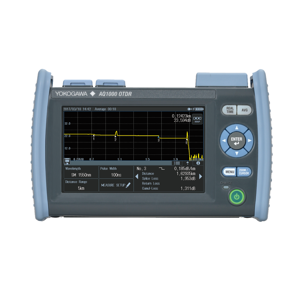 Yokogawa AQ1000 OTDR Tester with 1310/1550nm Wavelengths, 32/30dB Range, Multi-Touch Display, VLS/WLAN Options, 10-Hour Battery